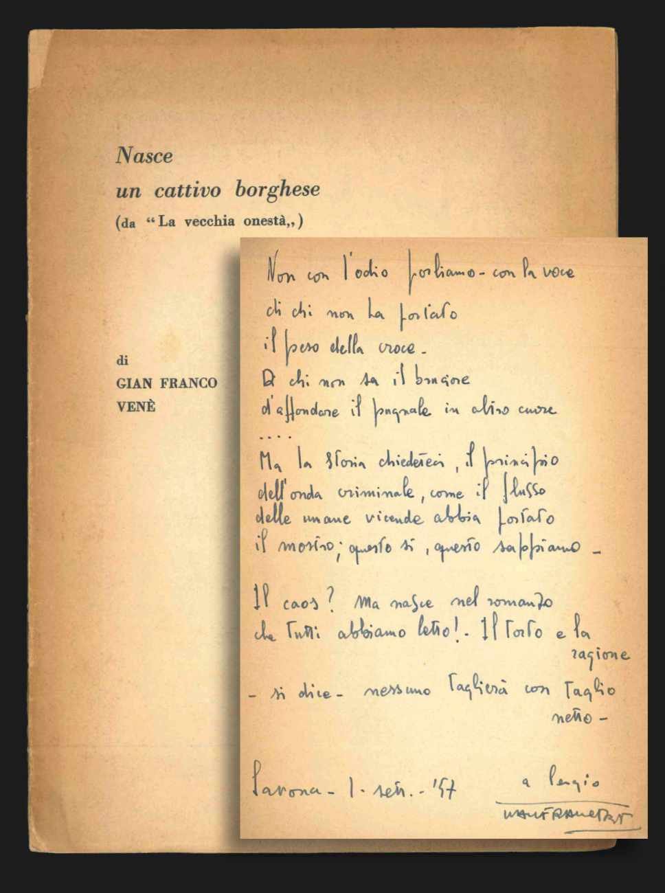 LIBROPrima edizione autonoma.CON AUTOGRAFO.L’esemplare di Sergio Pautasso, con lunga dedica autografa dell’autore alla seconda di copertina, in forma di poesia.«La vecchia onestà» viene annunciato come volume di prossima pubblicazione.