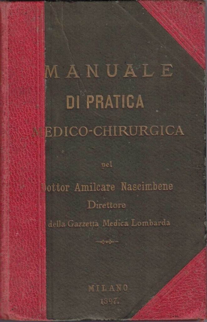 Manuale di pratica medico-chirurgica per dottor Amilcare Nascimbene, Stabilimento Tipo-litografico A. rancati, Milano 1897, pp. 384, cm 18, legatura ed. in mezza tela rossa con angoli, tagli spruzzati in rosso e titoli in oro al dorso e al piatto. Qualche cerniera interna con vecchi rinforzi in carta, per il resto leggere tracce d’uso, sporadiche fioriture, lievissima brunitura della carta, ma nel complesso ben conservato.