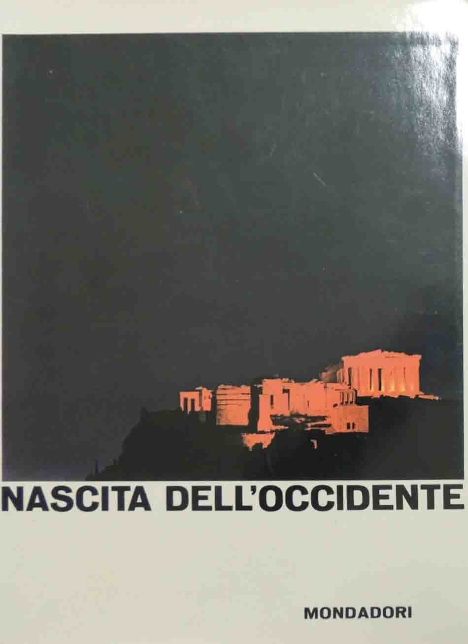 Nascita dell’Occidente. Grecia e Roma, testi di George Huxley et al., a cura di Michael Grant, traduzioni di Giuseppe Maria Cavalca, Augusta Mattioli, Annamaria Valente, Arnoldo Mondadori Editore, s.l. (ma stampato per la parte a colori in Germania, a Colonia, presso la DuMont Presse, per il resto in Italia, a Verona, presso le Officine Grafiche Veronesi della Arnoldo Mondadori Editore) 1964, prima ed., pp. 358, ill. b.n. e col. con ill. b.n. nel testo e col. su tavole, 5 c. di tavv. rip. comprese nel testo, legatura in tutta tela con titoli al dorso, decorazione al piatto e sovraccoperta. Testo stampato su carta azzurrina con ill. b.n. nel testo intervallato da tavole con ill. a colori. Testi di: George Huxley, A. R. Burn, H. C. Baldry, W. K. C. Guthrie, John Boardman, F. R. Cowell, R. A. G. Carson, Michael Grant, Sir Mortimer Wheeler, Michael Gough. Ideato e prodotto da Thames and Hudson. Capo redattore Max Parrish. Redazione di Ian Sutton e Mary bainbridge. Direzione artistica di Ian Mackenzie Kerr. Ricerche di R. Davidson-Houston e Susannah Plowright. Sovraccoperta di anita Klinz. Ricostruzioni di Alan Sorrell e William Suddaby. Cartine di John Woodcock. Piante e disegni di P. P. Pratt, Philip R. Ward, M. E. Weaver e Jon Wilsher. Fotografie di John R. Freeman, Josephine Powell, Edwin Smith, John Webb e Roger Wood. Indice: Michael Grant, Introduzione. La tradizione che ci domina – George Huxley, La genesi della Grecia. La storia che ispirò Omero – A. R. Burn, La nascita di un nuovo mondo. La lotta della città-Stato – H. C. Baldry, La voce della Grecia. La prima grande letteratura e il suo contesto vivente – W. K. C. Guthrie, La rivoluzione del pensiero. I vecchi dèi e la nuova ragione – John Boardman, La sublime impresa. Le arti figurative e l’architettura della Grecia – F. R. Cowell, La vita nell’antichità. La vita quotidiana in Grecia e a Roma – R. A. G. carson, Una città che abbraccia il mondo. Dai Sette Colli del Tevere al dominio sul mondo – Michael Grant, Poesia, prosa e retorica. La letteratura latina – Sir Mortimer Wheeler, Dalla visione all’introspezione. Le arti figurative e l’architettura di un impero universale – Michael Gough, Verso la città di Dio. Un ponte di fede dal mondo classico a quello medievale – Bibliografia essenziale – Cronologia della storia greca – Cronologia della storia romana – Elenco e fonti delle illustrazioni – Indice analitico. Uno strappetto alla sovraccoperta, per il resto perfetto.