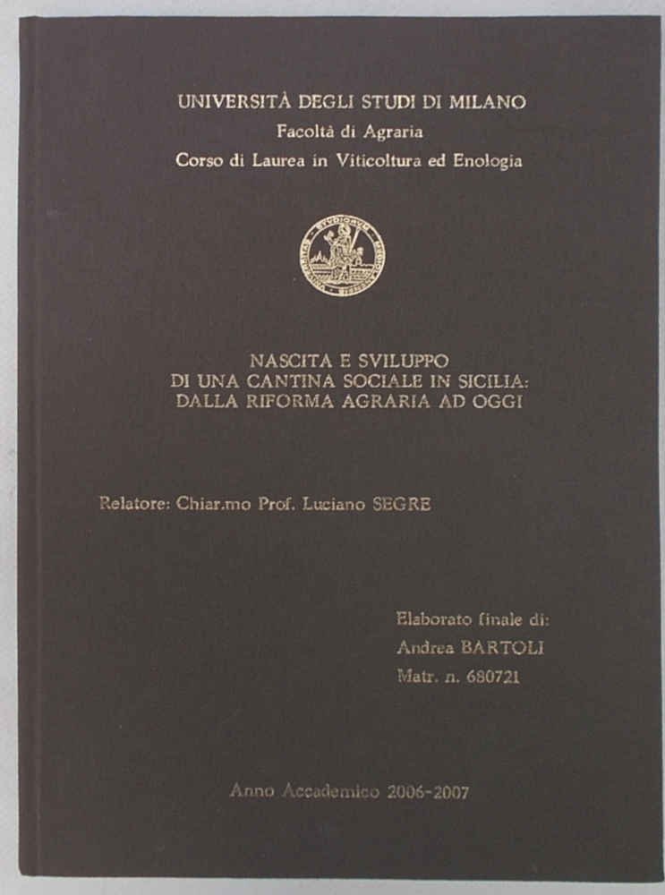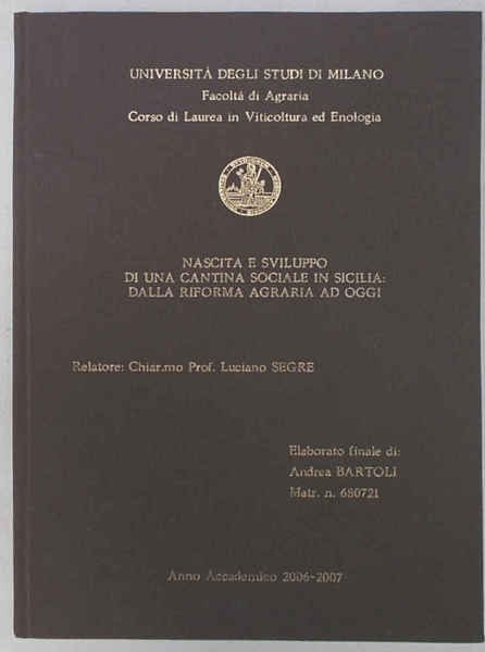 In 4° (cm. 30 x 21,5); pagg. 103; con numerose illustrazioni fotograf. anche a colori n.t.; tela originale con titoli in oro. VG. ** Cantine Settesoli di Menfi in provincia di Agrigento. Relatore Prof. Luciano Segre. Tesi di laurea.