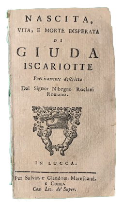 In 12°; (12) pp. Senza brossura. Rarissima placchetta stampata a Lucca da Marescandoli di questa storia poetica della vita di Giuda Iscariota e del suo tradimento scritta dal romano, Nibegno Roclami. L'opera, di chiara ispirazione popolare, ripercorre le vicende della vita di Giuda dalla nascita alla fine della sua vita. Esistono riedizoni di questo libello stampate nell'ottocento. Giuda Iscariota è una figura centrale nel Nuovo Testamento, noto per il suo tradimento di Gesù Cristo. Era uno dei dodici apostoli scelti da Gesù e svolgeva il ruolo di tesoriere del gruppo. La sua storia è intrecciata con quella della Passione di Cristo e il suo nome è diventato sinonimo di tradimento. Secondo i Vangeli, Giuda, spinto da motivi non del tutto chiari, decise di tradire Gesù. Alcuni suggeriscono che fosse motivato da avidità, poiché ricevette trenta monete d'argento dai capi sacerdoti per rivelare il luogo in cui Gesù si trovava. Altri interpretano il suo gesto come un atto spinto da disillusione o da una diversa comprensione della missione messianica di Gesù. La notte del tradimento, Giuda guidò una folla armata al Giardino di Getsemani, dove Gesù pregava con i suoi discepoli. Per identificare Gesù ai soldati, Giuda lo baciò, un atto che da allora è conosciuto come il "bacio di Giuda". Questo gesto permise ai soldati di arrestare Gesù, portandolo poi al processo e alla crocifissione. Dopo il tradimento, Giuda fu sopraffatto dal rimorso. Secondo il Vangelo di Matteo, tentò di restituire le monete d'argento ai capi sacerdoti, ma essi rifiutarono. Disperato, Giuda si suicidò impiccandosi. Altre versioni, come quella riportata negli Atti degli Apostoli, narrano che Giuda morì in circostanze diverse, cadendo e spaccandosi il ventre. La figura di Giuda Iscariota rimane una delle più controverse e discusse della tradizione cristiana, rappresentando il tema universale del tradimento e delle sue conseguenze. Opera in buone condizoni di conservazione.
