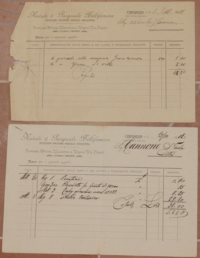 Raccolta di due fatture datate 8 settembre 1911 e 27 ottobre 1912 dell'industria di accessori di macchine industriali "Natale & Pasquale Bellifemine" di Cerignola. Lista manoscritta del materiale e servizio acquistato: Puntine, Chiodetti, tubo di gomma nera 15x23, acido tartarico con i relativi prezzi. In buone condizioni, piegature del foglio. Dim. cm 16,5x24.Beautiful collection of two invoice dated 8th of september 1911 and 27th of october 1912 of the industry of accessories for agricultural industrial machines "Natale & Pasquale Bellifemine" in Cerignola. List of goods with prices. In good conditions, folding.