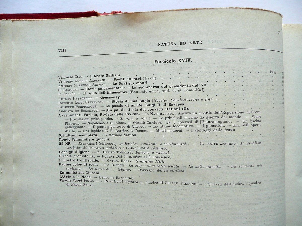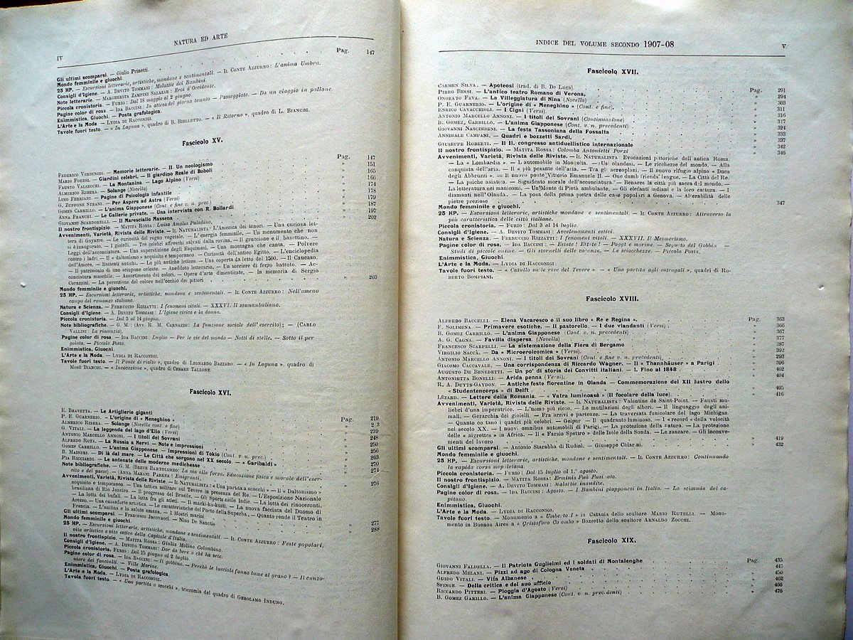 12 numeri completi di rivista, † Natura ed Arte" rassegna quindicinale illustrata italiana e straniera di scienze, lettere ed arti 1907 - 08 12 numeri completi corrispondenti al secondo semestre Vallardi, Milano 1907; cm 29,5x20,5; pp. 864-96-96, con numerosissime ill. in b/n nel t. e fuori t. (qualcuna a colori); legatura d'epoca in mezza pelle con titolo impresso in oro al dorso. 12 numeri completi di rivista, corrispondenti al secondo semestre 1907-08, inseriti entro unico volume. † Condizioni di conservazione Esemplare ben conservato con tracce d'uso; coperta con alcune piccole abrasioni, graffietti e mancanze principalmente ai margini dei piatti e al dorso. Interni buoni; qualche pagina con lievi accenni d'ingiallimento dovuti all'et‡ e al tipo di carta; poche pagine con minime pressochÈ trascurabili abrasioni da distacco che non comportano perdite di testo o alle illustrazioni; ultima pagina con alcuni strappetti, tracce di pieghe e una piccola mancanza alla parte inf. (vedi foto). † 12 numeri completi, corrispondenti al secondo semestre dell'annata 1907-08. Rivista dall'ampio ventaglio tematico. Presente un articolo di Guido Vitali intitolato "Vita albanese - ricordi di Albania", uscito su tre fascicoli (il XIX, il XX, il XXI); uno di Giuseppe Costa intitolato "una caccia al cinghiale in Sardegna" (fascicolo XIII); uno di Annibale Campani intitolato "quadri e bozzetti sardi" (fascicolo XVII), ecc. † SETT183.L17215 N "