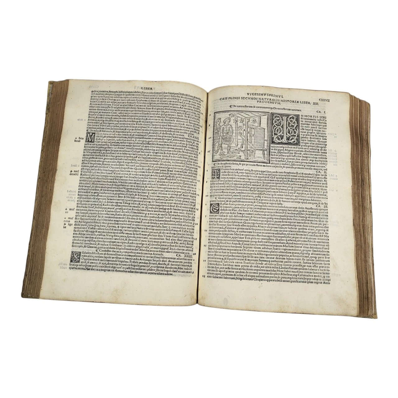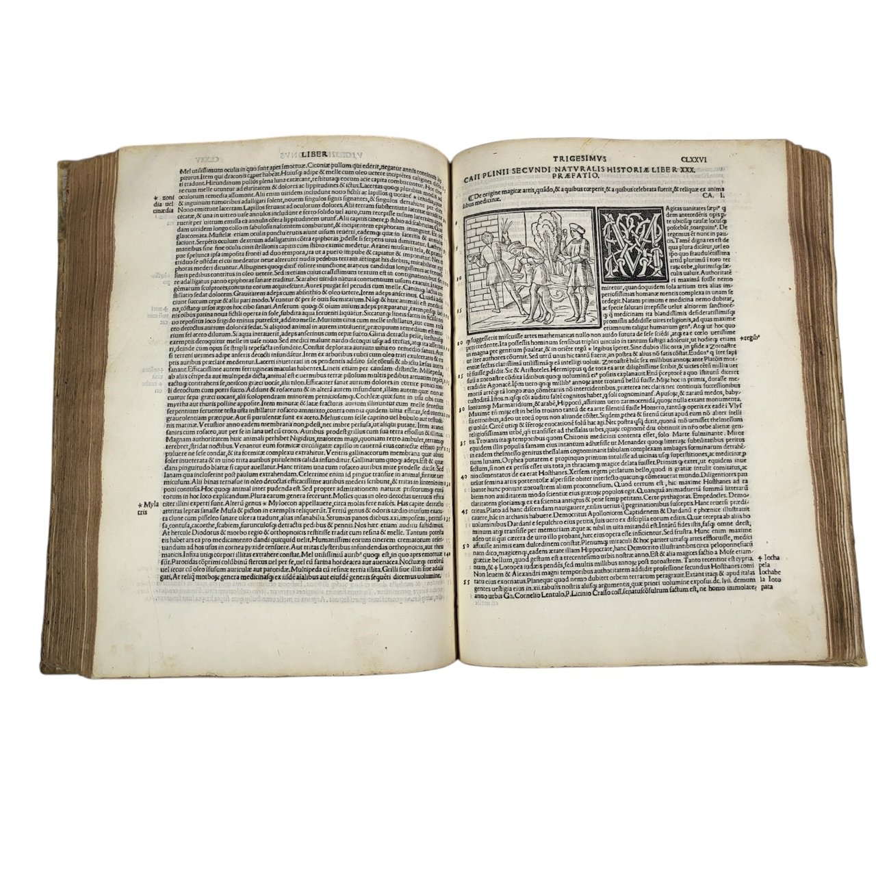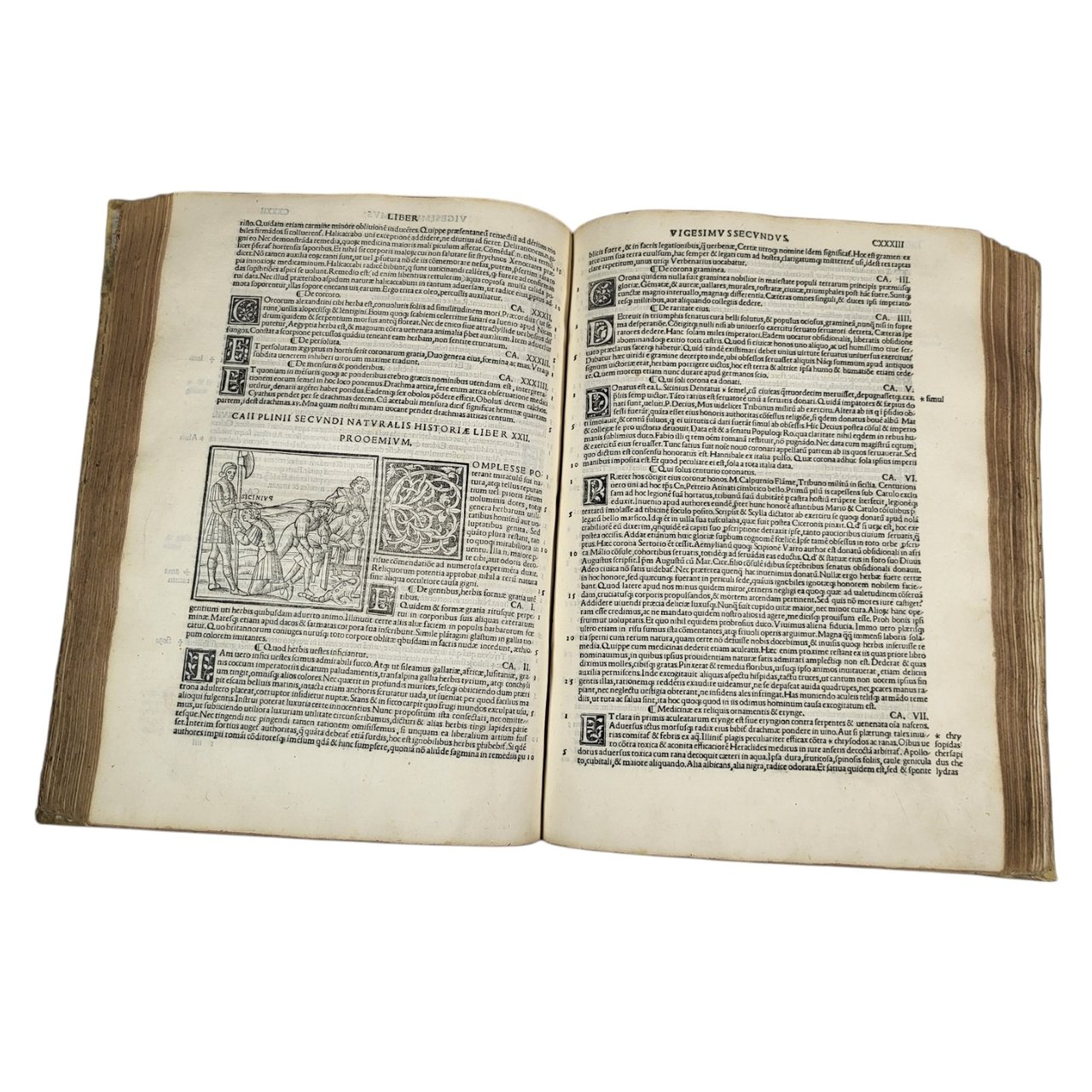 Splendid illustrated and genuine Sessa edition of « the most popular natural history ever written" by Pliny The Elder, here with the commentary of the humanist Barbaro. Two complete parts, collected in a single folio volume, with two elaborate woodcut title pages printed in red and black. Contains charming 32 beautiful woodcut illustrations in the text, as well as 3 small maps and numerous large elegant initials, which made this edition published and printed by the Sessa family one of the most successful of the 16th century.