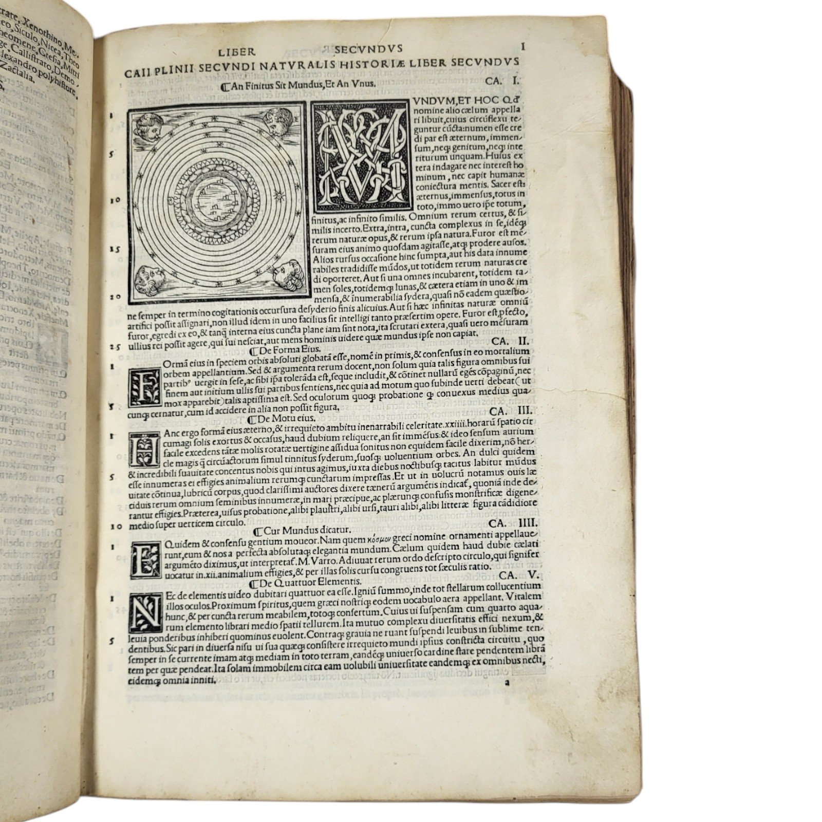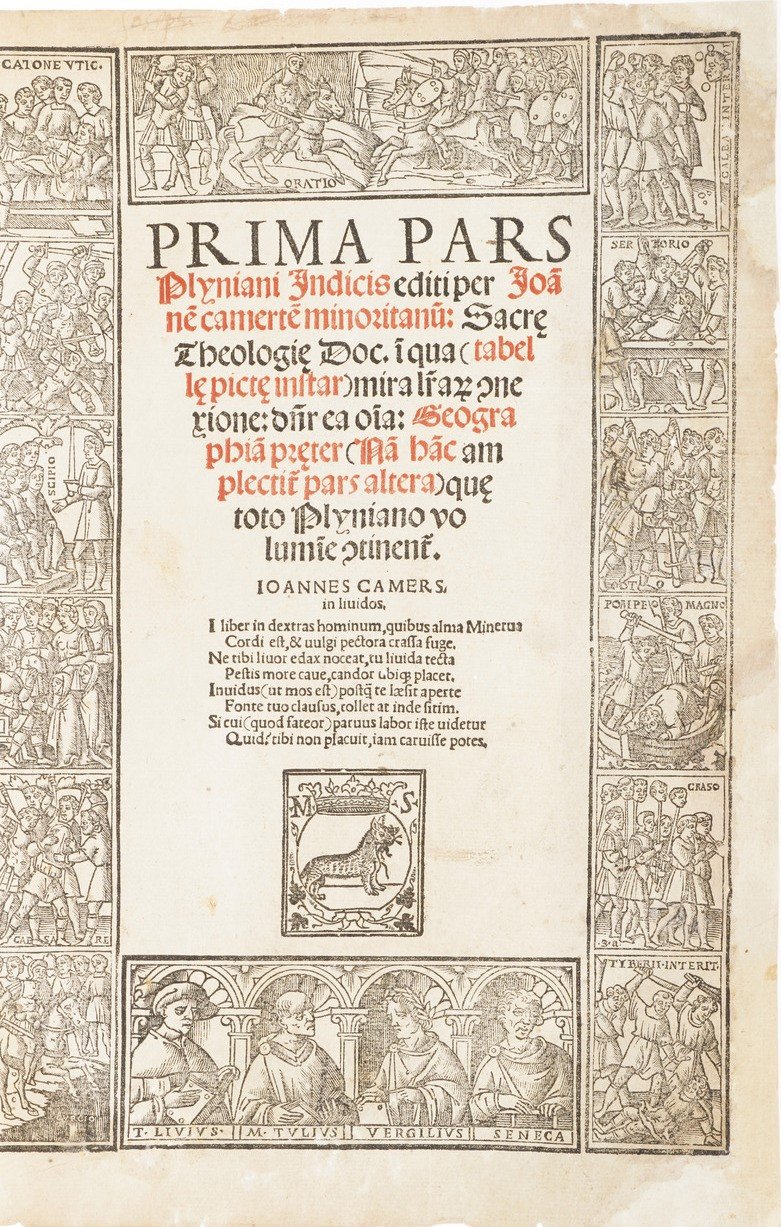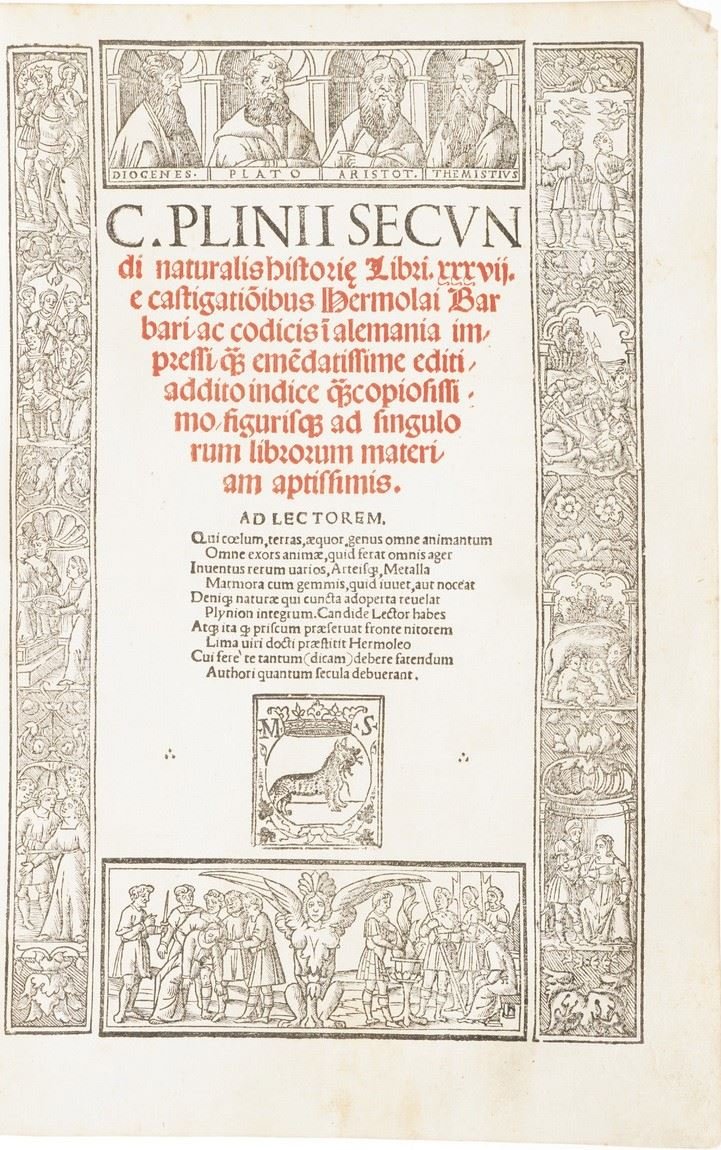 Buona edizione illustrata e bella copia della « piu popolare storia naturale mai scritta ». Celebre opera di Plinio, qui con il commento dell’umanista Ermolao Barbaro e le seducenti illustrazioni, che fecero di questa edizione edita e stampata dai Sessa una della piu fortunate del secolo XVI. Sono presenti gli indici del Camers con numerazione separata per navigare tra i i 20'000 fatti raccolti da 200 libri e da oltre 100 autori selezionati che coprono cosmologia, matematica, geografia, medicina, zoologia, agricoltura, botanica, storia, filosofia, antropologia, mineralogia e arti e letteratura. In effetti gli autori consultati e citati sono 473 (146 romani e 327 greci).