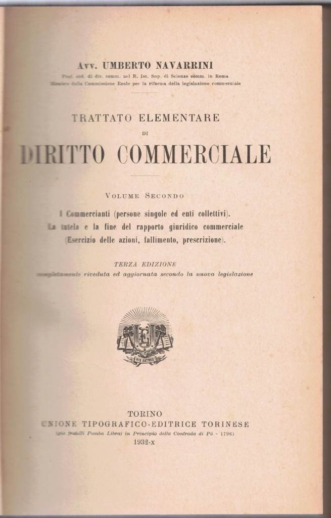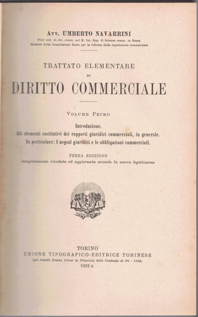 Avv. Umberto Navarrini, Trattato elementare di diritto commerciale, Unione Tipografico-Editrice Torinese, Torino 1932, 2 voll., terza ed. completamente riveduta ed aggiornata secondo la nuova legislazione, pp. VI, 954, cm 24, legatura ed. originali in tutta tela con titoli al dorso e fregio editoriale a impressione al dorso e al piatto. Conservata la legatura originale. Volume primo: Introduzione – Gli elementi costitutivi dei rapporti giuridici commerciali, in generale – In particolare: i negozi giuridici e le obbligazioni commerciali, pp. VI, 524. Volume secondo: I commercianti (persone singole ed enti collettivi) – La tutela e la fine del rapporto giuridico commerciale (esercizio delle azioni, fallimento, prescrizione), pp. 430. Firma d’appartenenza alla prima carta di ciascun volume. Qualche macchiolina ai tagli di entrambi i volumi e alla legatura del secondo volume, sporadiche e lievi sottolineature e annotazioni a margine a lapis, minime fioriture, tenue brunitura della carta, per il resto e nel complesso volumi ben conservati.
