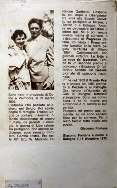 Soggetti: Biografie, Memorie, Romanzi storici, Resistenza, Liberazione, Partigiani, Comunismo, Anti-fascismo, Seconda Guerra Mondiale, Staffette, Brigata Marcobi, Brigate Garibaldi, Emilia Romagna, Emiliani, Compagni, Racconti, Letteratura italiana, Narrativa, Nazismo, Occupazione, Libertà, Lotta politica, Storie vere, Bologna, Appennino, 1943, Armistizio, 8 settembre, Libri Vintage, Fuori catalogo, Libri rari, Anni Settanta, Saghe familiari, Anni Venti, Anni Trenta, Mussolini, Anni Quaranta, Soldati, Repubblica di Salò, Contadini, Dialetto emiliano, Bassa, Stragi fasciste, Eccidi, Marzabotto, Guerriglia, Guerra civile, Biographies, Memoirs, Historical novels, Resistance, Liberation, Partisans, Communism, Anti-fascism, World War II, Relay races, Garibaldi Brigades, Companions, Tales, Italian literature, Fiction, Nazism, Occupation, Freedom, Political struggle, True Stories, Apennines, Armistice, 8 September, Out of print Books, Rare Books, Seventies, Family Sagas, 1920s, 1930s, 1940s, Soldiers, Salò Republic, Peasants, Emilian Dialect, Fascist massacres, Guerrilla, Civil war
