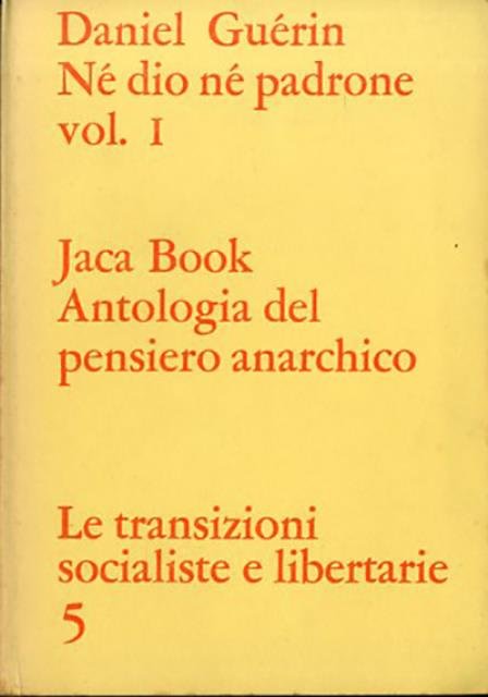 2 v. (459; 416 p.) ; 17 x 12 cm. Le transizioni socialiste e libertarie, 5/6. In questi due volumi l'autore presenta una selezione di testi di Max Stirner; Pierre Joseph Proudhon; Michail A. Bakunin; La controversia tra César de Paepe e Adhémar Schwitzguébel; James Guillaume e Pëtr A. Kropotkin; Errico Malatesta; Emile Henry; Gli anarchici francesi nei sindacati; Le collettività spagnole; Volin; Nestor Machno; Kronstadt; Gli anarchici in prigione di Gaston Leval; L'anarchismo nella guerra di Spagna; Durruti e la guerra di libertaria; L'anarco-sindacalismo al governo. Titolo originale dell'opera: «Ni dieu, ni maître». Traduzione di Carlo Giannetto, Laura Meda, Antonio Barberini e Pierpaolo Poggio. Brossura editoriale, coperta in cartoncino flessibile colorato (giallo), titolo impresso in rosso al piatto e al dorso. Qualche leggero segno del tempo ai tagli e alle pagine interne (ingiallimento della carta), minute fioriture sparse alle pagine di guardia e ai tagli, per il resto libro integro. Codice libreria 9330.