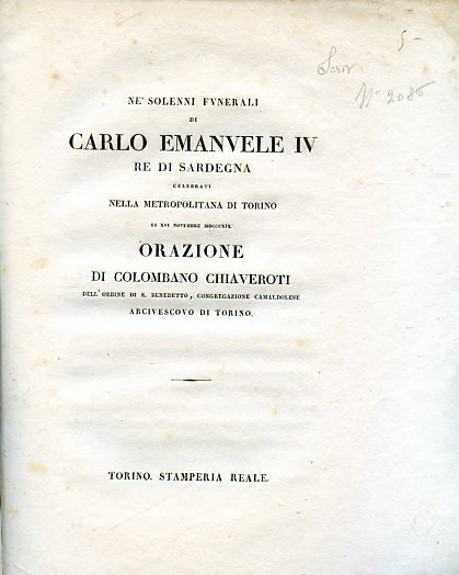 Ne' solenni funerali di Carlo Emanuele IV Re di Sardegna celebrati nella Metropolitana di Torino li XVI novembre MDCCCXIX. Orazione