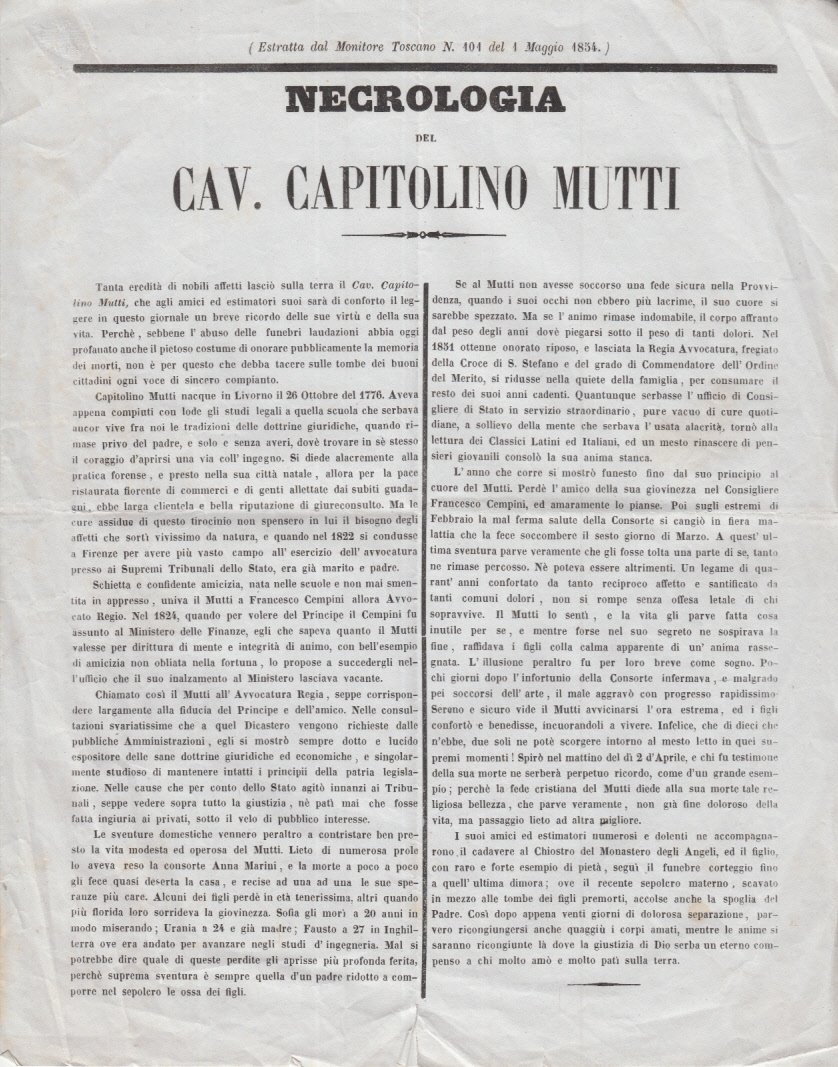 Due carte delle quali solo la prima con testo di Cm 27 x 21,5. Estratto dal monitore Toscano n.101 del 1 Maggio 1854. Due piccoli strappetti margine inferiore, pieghette. MOLTO BUONO - Capitolino Mutti nacque a Livorno il 26 Ottobre 1776, nel 1882 si trasferi' a Firenze per esercitare la professione di avvocato presso i Supremi Tribunali dello Stato. Fu seppellito presso il chiostro del monastero degli Angeli di Firenze