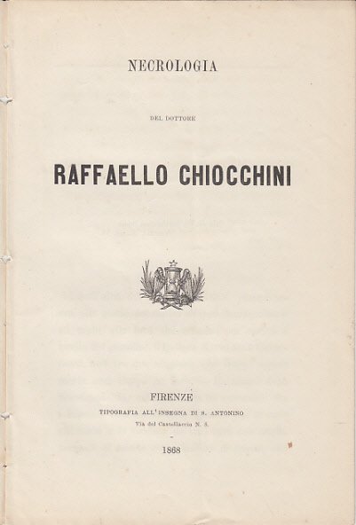 In-8 (Cm 21,5 x 14,5), pp. 12, manca la brossura. BUONO - Raffaello Chiocchini nacque a Firenze nel 1813 da Pietro e Anna Tartini. Fu allievo di Gatteschi e Inghirami