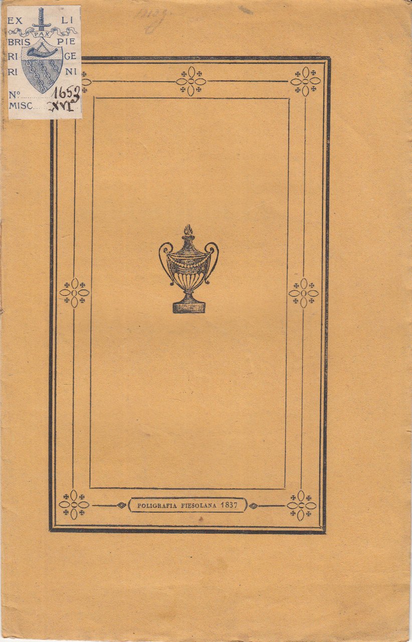 In-8 (Cm 23,5 x 15), pp. 8, brossura editoriale illustrata. Ex Libris Pieri Gerini. Ingialliture sparse, piccolo strappetto ad una pagine. Ordinari segni del tempo. BUONO - Giuseppe Lustrini nacque a Firenze dal va. comm.re Luigi diretore delle poste e dalla sig. ra Isabella Rossi nel giorno 11 Gennaio 1811. Ebbe la sua educazione presso il collegio di Lucca e prosegui' gli studi presso i PP. Scolopi a Firenze. Laureato in legge divenne avvocato nel 1836 pochi mesi prima di morire.