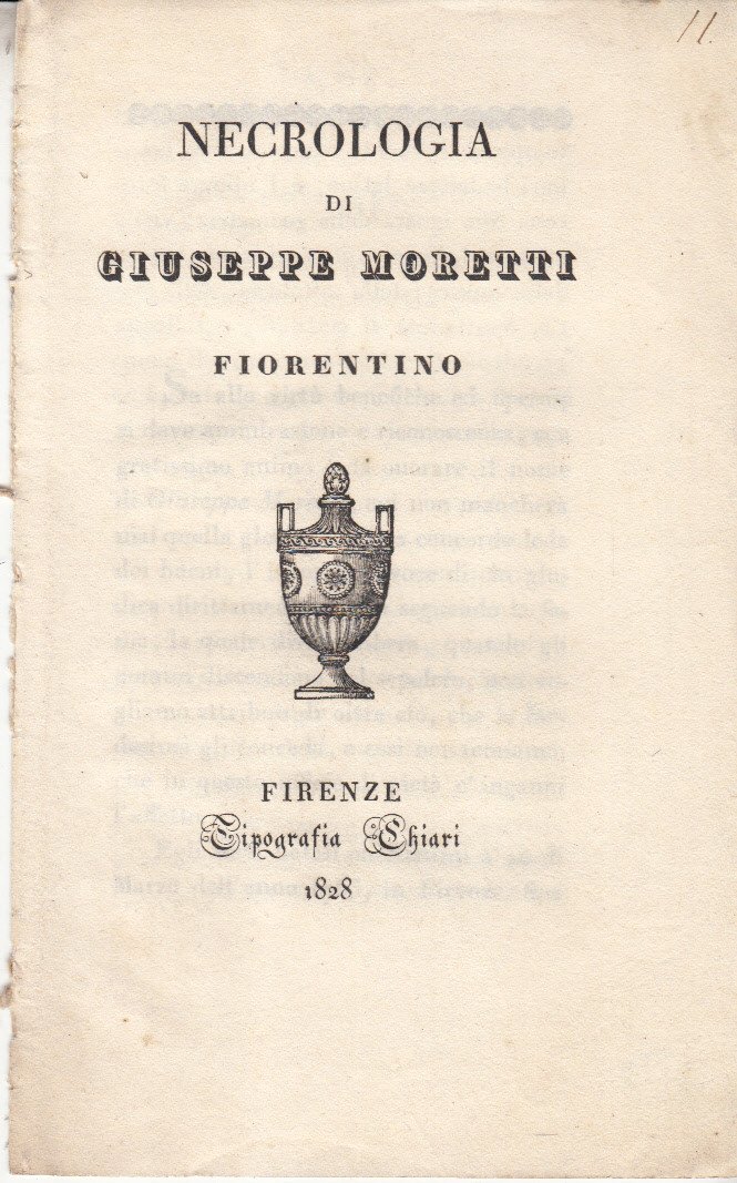 In-16 (Cm 18 x 11,5), pp. 11. Senza brossura con leggera allentatura - Giuseppe Moretti notabile toscano fu, tra l'altro, responsabile della R. Depositeria sotto il Regno Borbonico e sotto Ferdinando III.