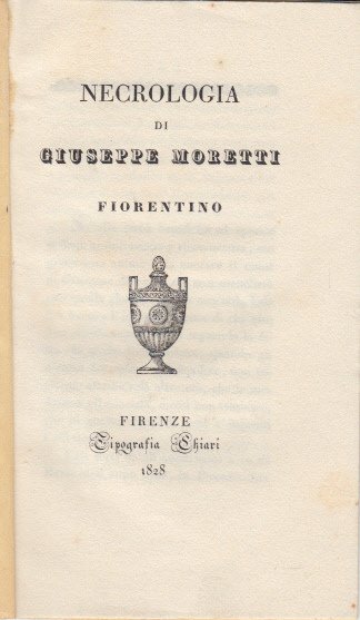 In-16 (Cm 19 x 11), pp. 10, brossura muta. Ex libris Pieri Gerini. MOLTO BUONO - Giuseppe Moretti fu, tra l'altro, contabile della Regia Depositeria sotto Leopoldo Secondo.