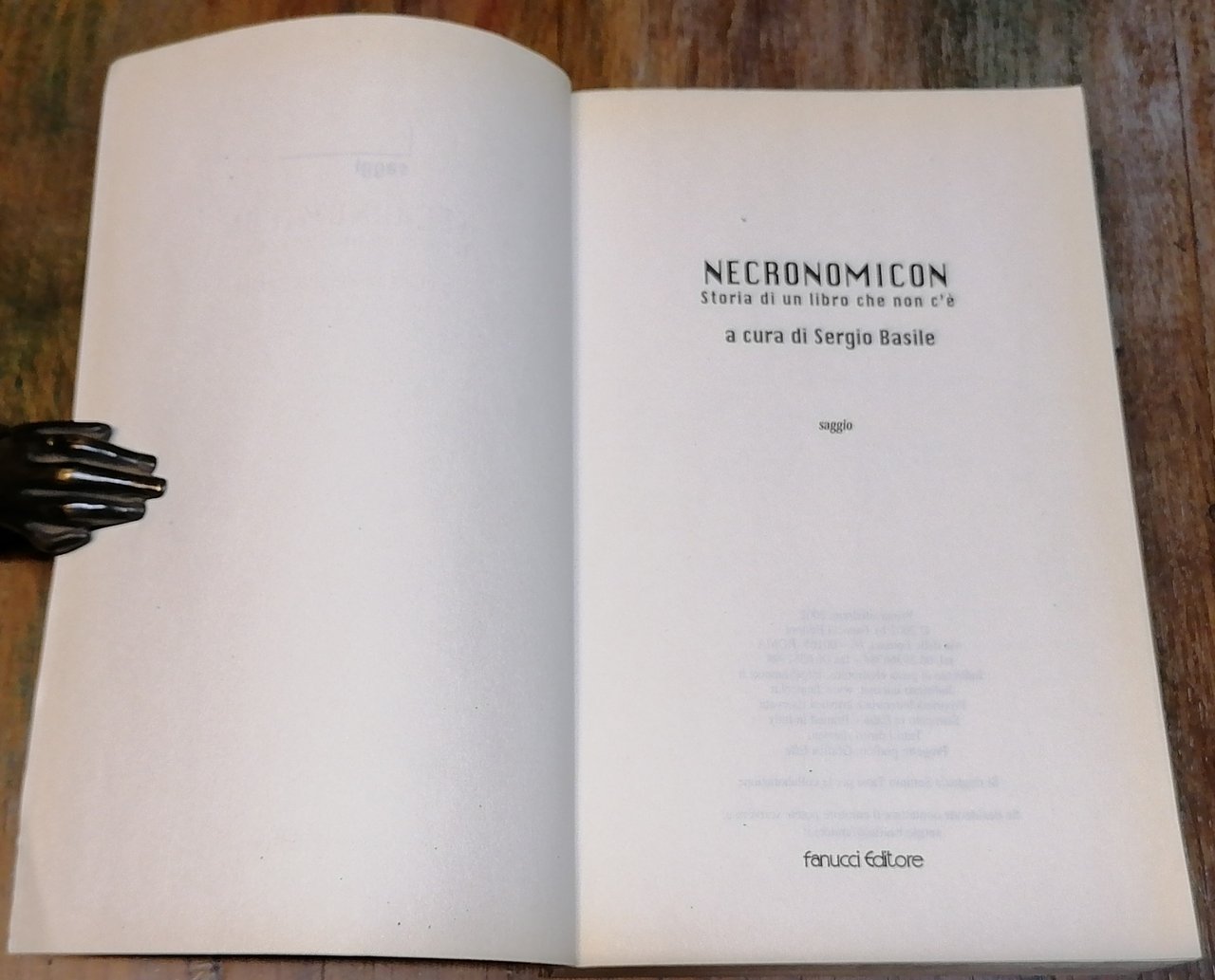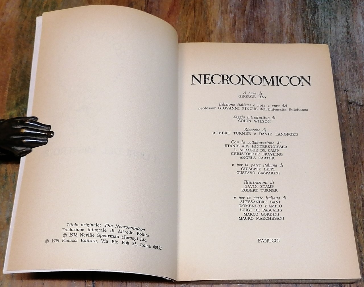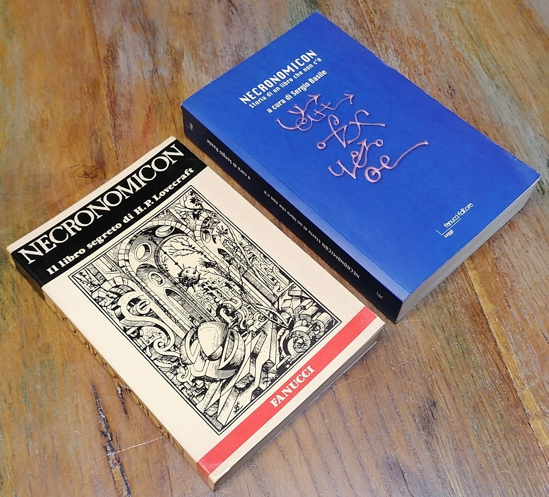 (Pseudobiblia; Letteratura fantastica) Due volumi in 8°, brossure editoriali illustrate. "Necronomicon. Il libro segreto di H. P. Lovecraft", Roma, Fanucci, 1979, pp. 238 con figure nel testo, a cura di George Hay, traduzione di Alfredo Pollini, collana "Zodiaco. I Libri del Mistero" (2). "Necronomicon. Storia di un libro che non c'é", Roma, Fanucci, 2002, pp. 476,(4), con figure nel testo, a cura di Sergio Basile, collana "Saggi". Ottimo stato di conservazione.