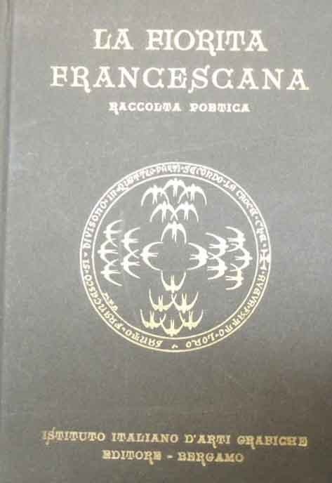 Tommaso Nediani, La fiorita francescana. Saggio d’una antologia della poesia francescana, con una lettera del Cardinale Segretario di Stato, fregi e composizioni di Luigi Zago e Mario Barberis, Istituti Italiano d’Arti Grafiche Editore, Bergamo s.d. (1925?), pp. 374, ill. coll., testatine e finalini ornamentali, cm 18, cart. ed. con titoli e fregi in oro al piatto. Titolo al piatto: La fiorita francescana. Raccolta poetica. Antologia di poesie ispirate a San Francesco e alla sua regola. In apertura, lettera del Cardinale Gasparri. Firma d’appartenenza e data alla prima pagina. Molto ben conservato.