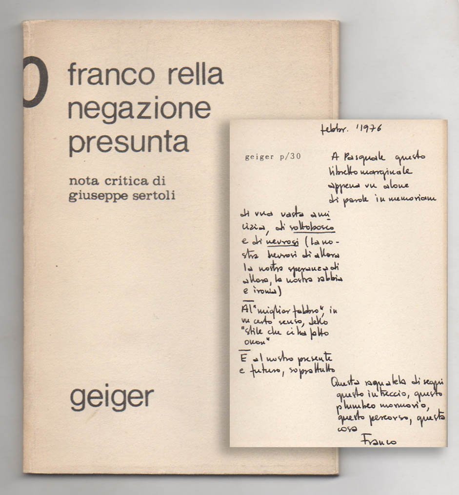 LIBROPrima edizione.CON AUTOGRAFO.Straordinario esemplare pregiato da un lungo componimento autografo di dedica che occupa tutta la pagina di occhiello.Raro primo libro poetico. Il roveretano Franco Rella è professore ordinario di Estetica allo IUAV Venezia. Classe 1944, ha cominciato al principio degli anni ’70 con la rivista «Nuova Corrente»; nel 1973 ha curato, in coppia con Sertoli, due opere di Bataille («Abbe C» e «Nietzsche») e il «Nietsche» di Deleuze per l’editore Bertani di Verona, inaugurando un’ampia produzione curatoriale di specialista delle filosofie del Novecento.Bazzini e Gazzotti, Controcorrente. Riviste e libri d’artista delle case editrici della Poesia visiva, p. 94 n. 30