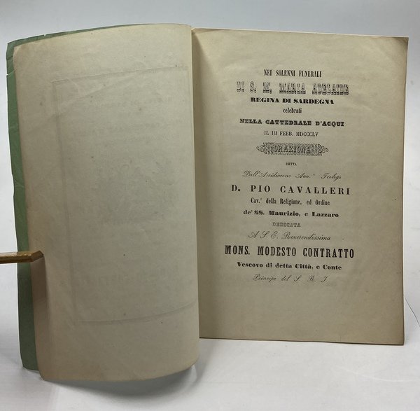 NEI SOLENNI FUNERALI DI S. M. MARIA ADELAIDE REGINA DI SARDEGNA celebrati NELLA CATTEDRALE D’ACQUI IL III FEBBRAIO MDCCCLV. ORAZIONE DETTA Dall’Arcivescovo Avv. Teologo D. Pio Cavalleri (…) dedicata a S. E. Reverendissima Mons MODESTO CONTRATTO Vescovo della Città, e Conte.