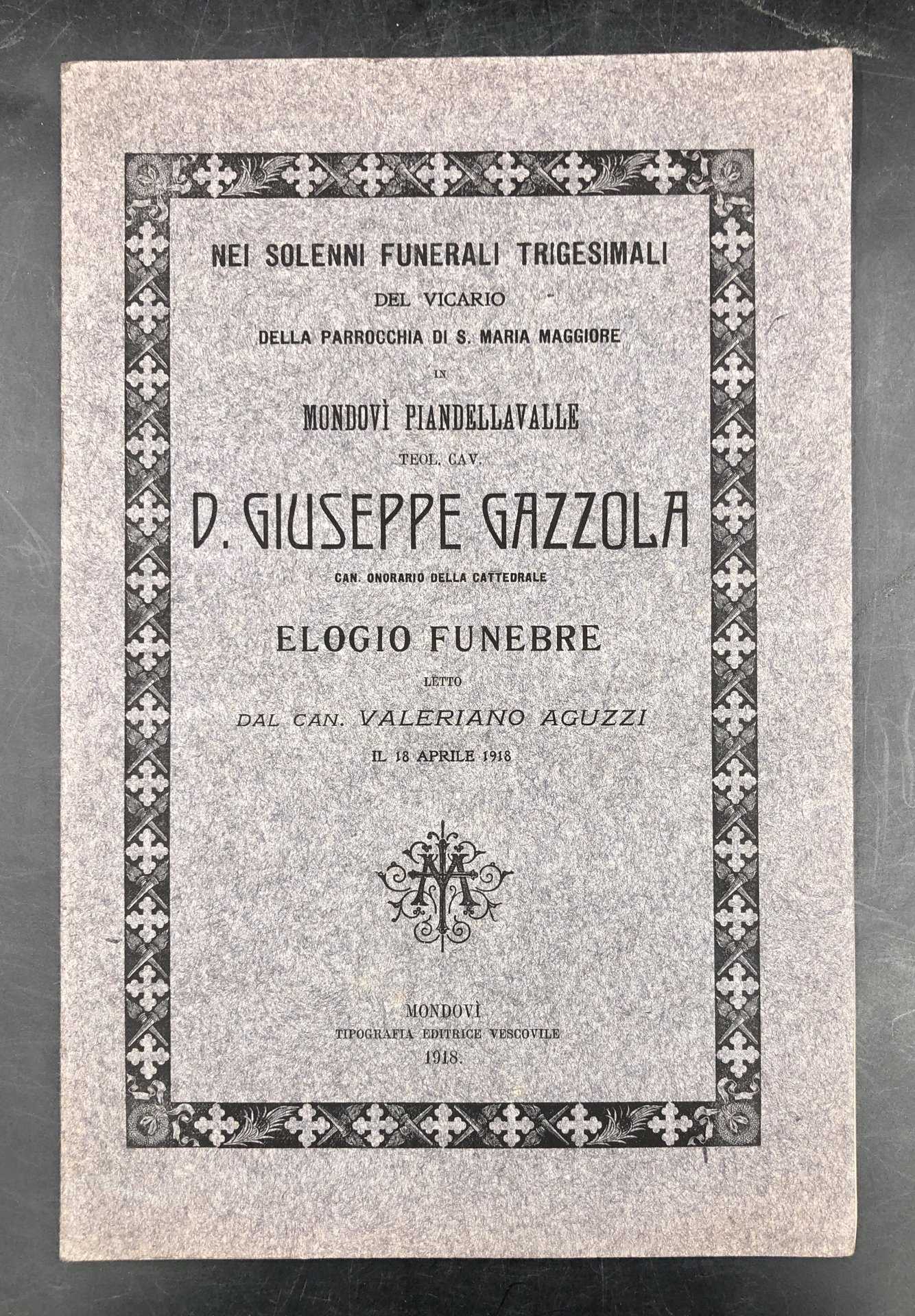 Nei solenni funerali trigesimali del Vicario della parrocchia di S. Maria Maggiore in MONDOVÌ PIANDELLAVALLE teol. D. Giuseppe GAZZOLA Can. Onorario della Cattedrale ELOGIO FUNEBRE. 18 aprile 1918.