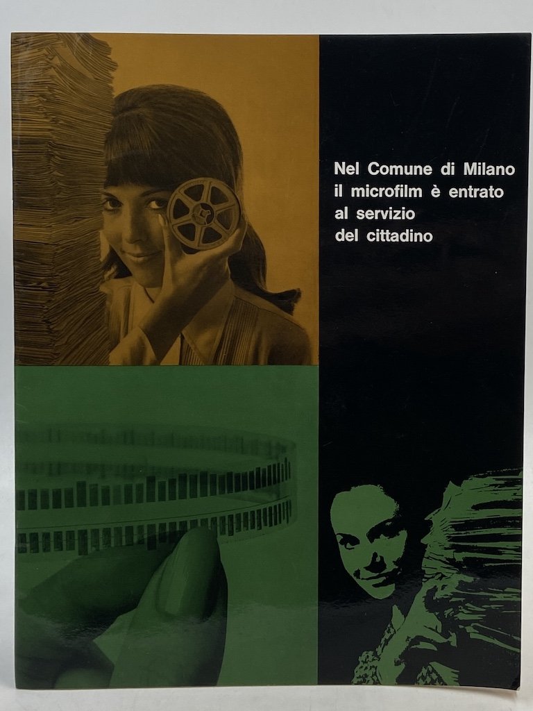 Opuscolo in brossura spillata, cm22x28, pp (12) illustrate in nero. Opuscolo pubblicitario del sistema di microfilmatura Recordak della Kodak, con fotografie delle attrezzature e degli archivi dell’Ufficio Stato Civile del Comune di Milano.