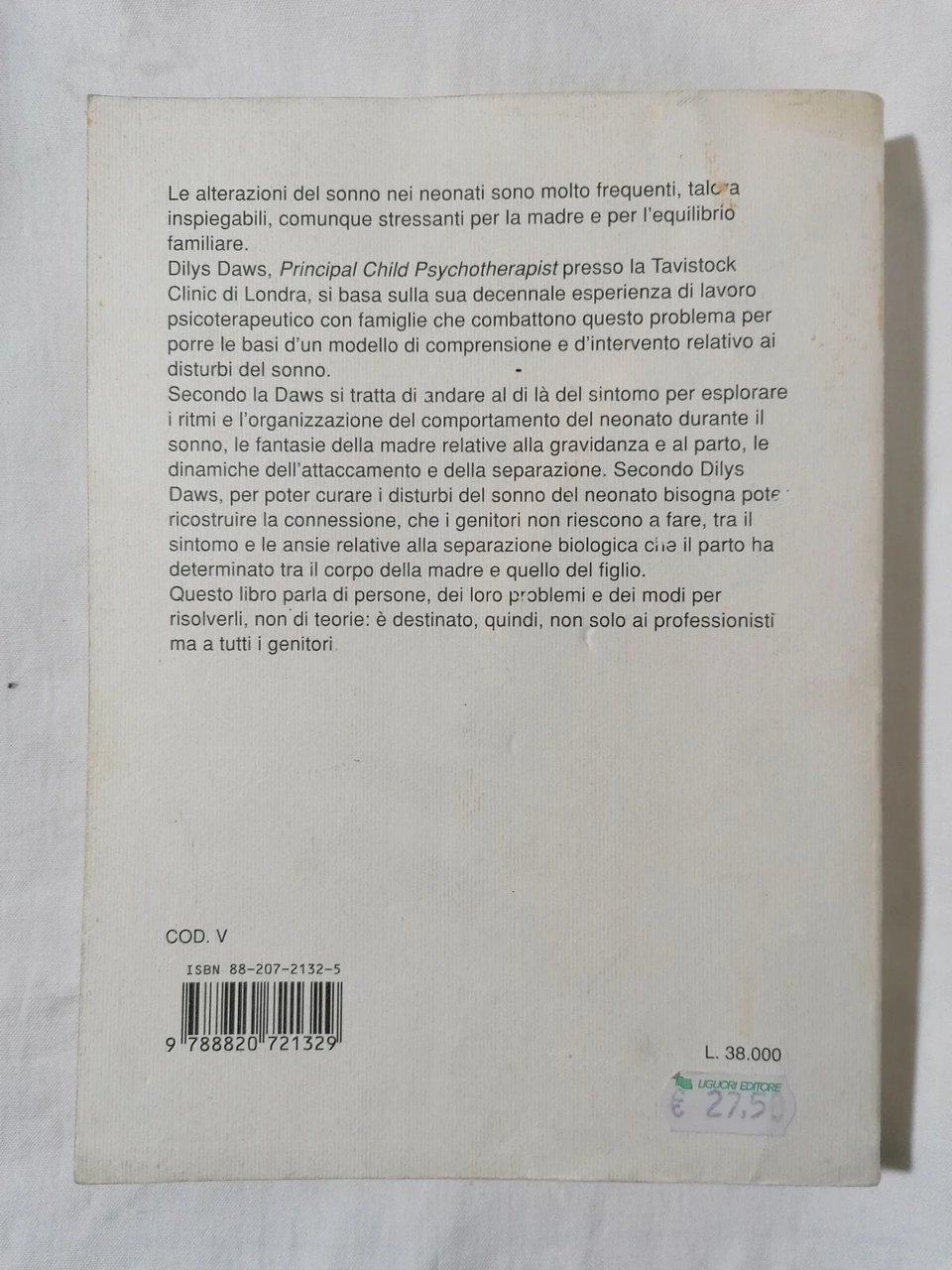 Prima edizione Liguori del 1992 BUONE condizioni generali (unico difetto una piega nell'angolo basso della copertina). Le alterazioni del sonno dei neonati sono molto frequenti, talora inspiegabili, comunque stressanti per la madre e per l'equilibrio familiare. [...] Secondo Daws si tratta di andare al di là del sintomo per esplorare i ritmi e l'organizzazione del comportamento del neonato durante il sonno, le fantasie della madre relative alla gravidanza e al parto, le dinamiche dell'attaccamento e della separazione. 2E-12-2