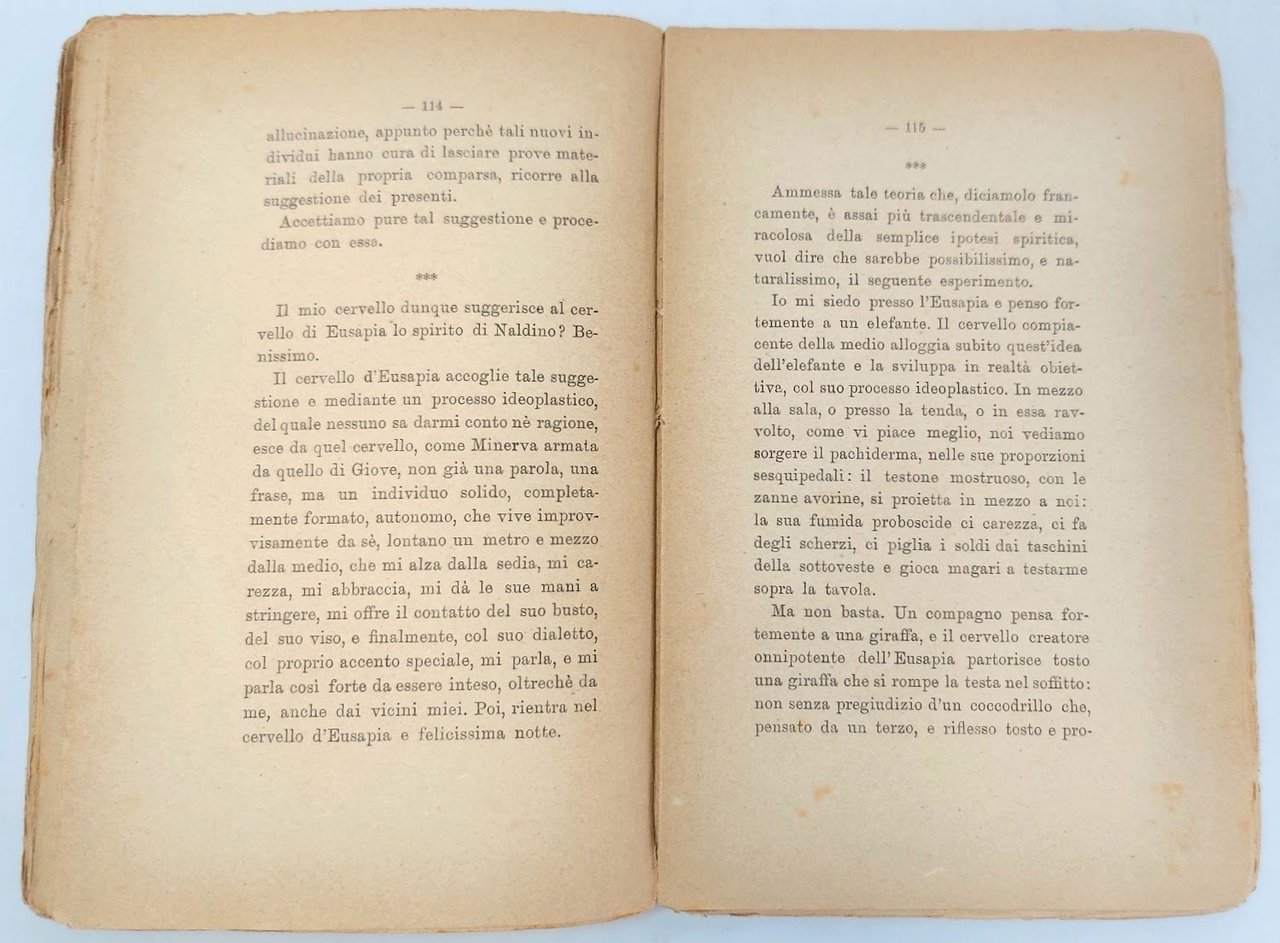 >in-16, pp. VIII, 181, broch. edit. figurata in nero (con piccole mancanze al dorso). Prima edizione. L'autore, giornalista e scrittore, direttore de Il Secolo XIX, fu anche direttore del Circolo Scientifico Minerva di Genova, che negli anni precedenti all'opera fu frequentato dalla medium Eusepia Palladino e da Cesare Lombroso, e che riuniva un gruppo di intellettuali e sperimentatori di spiritismo ed occulto. L'opera è un trattato sulle varie tendenze dell'occulto dei primi del '900. Buon esemplare nella sua brossura originale.