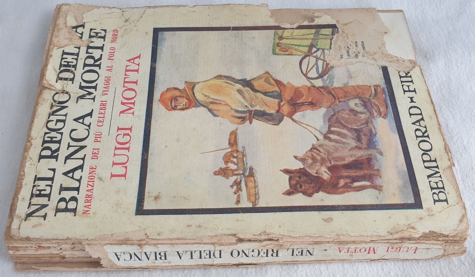 Edizione del 1929 di questa opera di viaggio al Polo Nord del giornalista e scrittore Luigi Motta (1881-1955). L'autore descrive una serie di esplorazioni in Polo Nord: i fratelli Zeno, Pietro Querini, Caboto, Da Verrazzano, Cartier, Willoughby, Chancellor, Frobisher, Pietro Plancio, Enrico Hudson, Bylot, Liakow, Franklin, Morton, Elling Carlsen, De Long, Padre Tosi, Nansen, Andree, Luigi Amedeo di savoia, Antonio Fiala, Roberto Peary, Rasmussen, Scroder Stranz ecc. Numerose planches fotografiche. In mediocri condizioni. Copertina editoriale inmediocri condizioni con parti mancanti ai margini e dorso. Legatura quasi assente. Pagine in discrete condizioni con rare fioriture. Segno di rosicchiatura di topo all'angolo inferiore destro con perdita di testo alle prime 26 pagine. In 8 cm. 24,5x17,5. Pp. 258. Edition of 1929 of this work of travel in North Pole byt he journalist and writer Luigi Motta (1881-1955). the author describes a series of explorations in North Pole: i fratelli Zeno, Pietro Querini, Caboto, Da Verrazzano, Cartier, Willoughby, Chancellor, Frobisher, Pietro Plancio, Enrico Hudson, Bylot, Liakow, Franklin, Morton, Elling Carlsen, De Long, Padre Tosi, Nansen, Andree, Luigi Amedeo di savoia, Antonio Fiala, Roberto Peary, Rasmussen, Scroder Stranz ecc. Different photographic planches. In poor conditions. Editorial cover in poor conditions with lackings in the extremities. Binding almost lacks. Pages in fair conditions with occasional foxing. Sign of mouse in the foot right corner with loss of text in the first 26 pages. In 8 cm. 24,5x17,5. Pp. 258