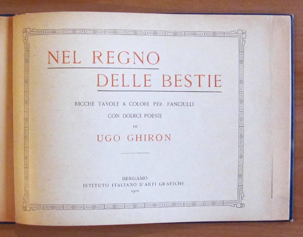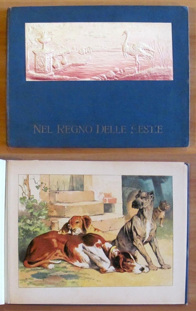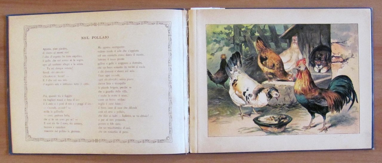 12 splendide tavole cromolitografiche di Ugo Ghiron alternate alle poesie. Ist. Italiano d'Arti Grafiche - Bergamo, 1910. Tela editoriale con bella illustrazione a rilievo applicata al piatto. Piccolo rinforzo alla cerniera interna di una pagina come da foto. 25,5x19,5; pp.28 non numerate. Raro, Buonissimo stato. , Molto buono (Very Good)