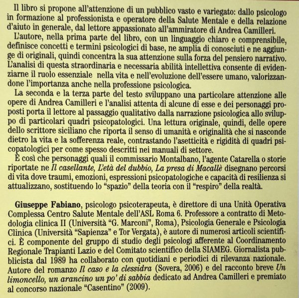Il volume sottolinea la forza del pensiero narrativo come componente essenziale della vita e dell'evoluzione dell'uomo, valorizzandone l'importanza anche nella professione psicologica. Soffermandosi sulle opere di Andrea Camilleri mostra come il commissario Montalbano, l'agente Catarella o altri personaggi di Camilleri disegnino percorsi di vita dove traumi, emozioni, espressioni psicopatologiche e capacità resilienziali si attualizzano, sostituendo lo spazio della teoria con il respiro della realtà.
