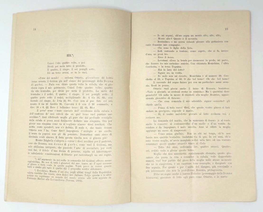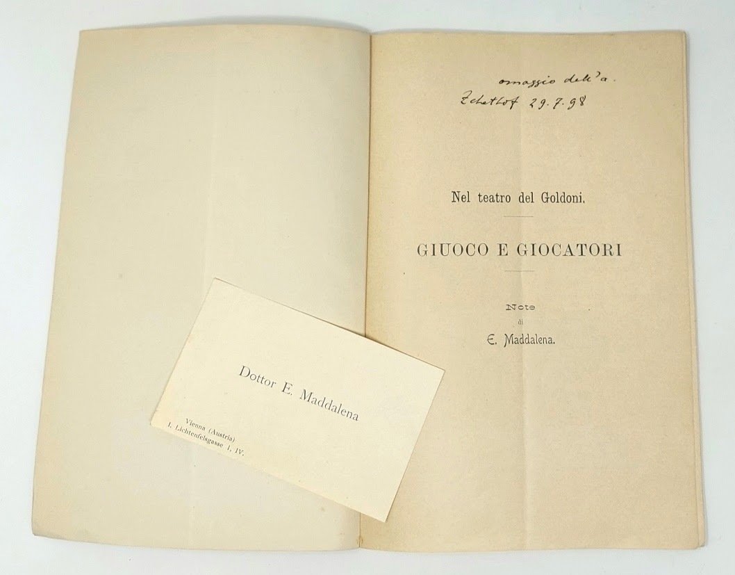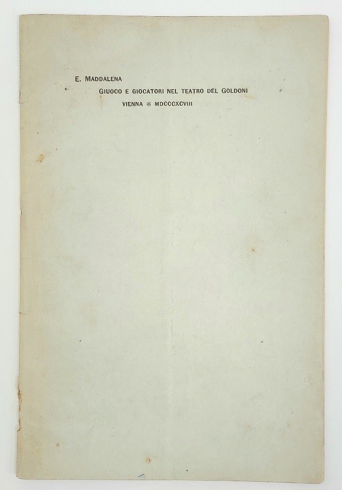 >in-8, pp. 56, broch edit. (minimi segni d'uso). Estratto da Resoconto annuale dell'Accademia di Commercio di Vienna (1898). Prima edizione, non comune, di curioso studio sul vizio del gioco nelle opere di Carlo Goldoni e del Goldoni stesso, preziosa monografia del Maddalena. "Ai risultati delle sue appassionate ricerche, dispersi in riviste e giornali, il M. pensò più volte di dare veste unitaria riunendoli in volume, ma non riuscì nel suo intento. Il materiale, reperito in numerose biblioteche europee e americane e in gran parte elaborato, ha ancora grande valore per gli studiosi quale testimonianza del carattere universale dell'opera goldoniana." (cfr. Diz. Biogr. Italiani). Perfetto esemplare, con invio autografo dell'A. all'occhietto e suo biglietto da visita.  Treccani. Dizionario Biografico degli Italiani - Volume 67 (2006).