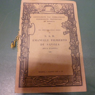 Opuscolo dell'Associazione Nazionale Combattenti, Federazione Provinciale di Modena, dedicato ad Emanuele Filiberto di Savoia, Duca d'Aosta, a trenta giorni dalla sua scomparsa.