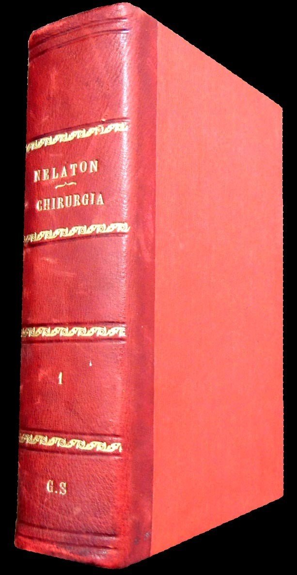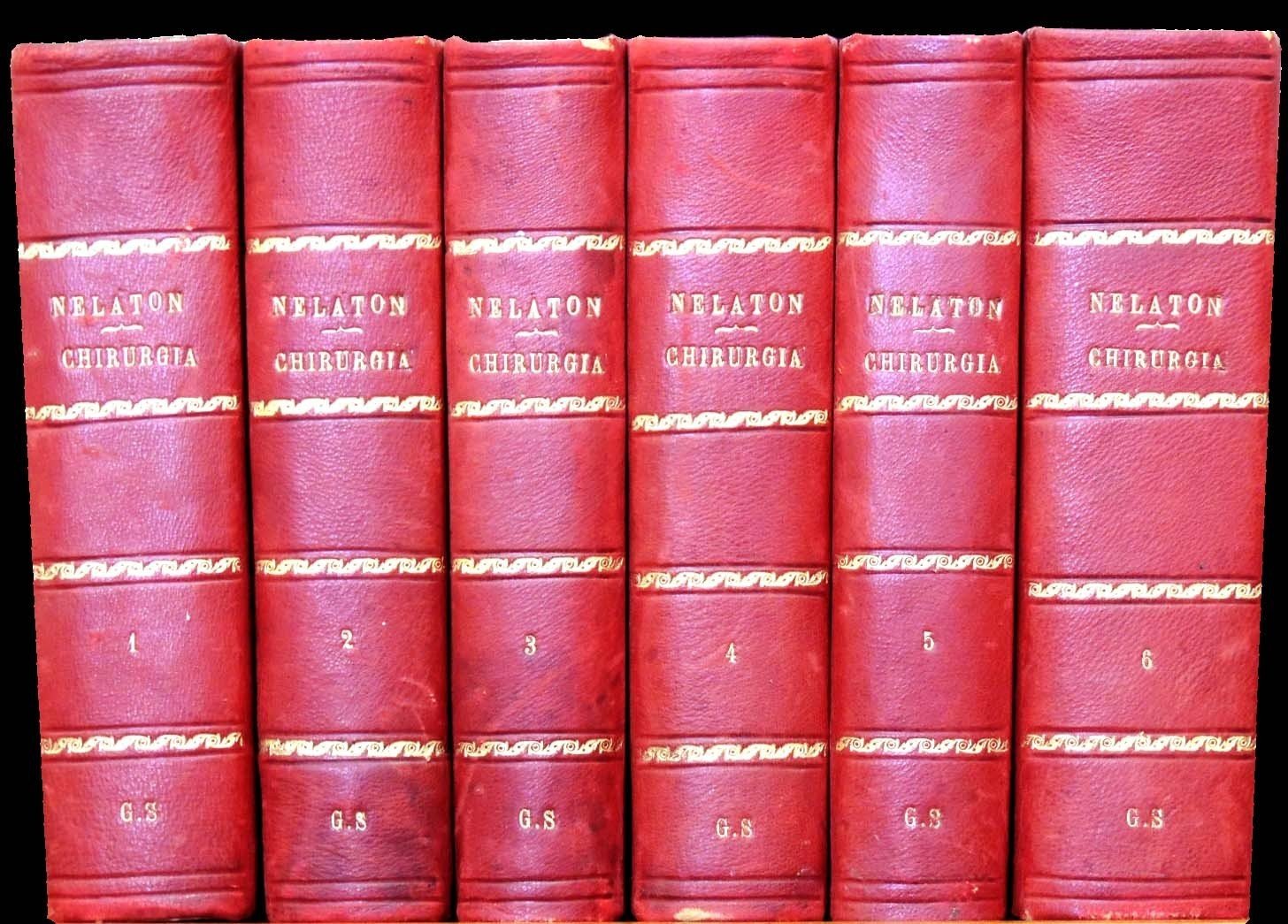 Elementi di patologia chirurgica di A. Nélaton, terza edizione italiana riveduta e corretta sull’ultima edizione francese del Péan dal Dottor A. Scambelluri con note ed aggiunte del Prof. A. d’Antona, con figure intercalate nel testo, Giovanni Jovene Libraio-Editore, Napoli 1881-1886, 6 voll, pp. 4877, ill. b.n., 3 c. di tavv. f.t. ill. b.n. e col., cm 23, eleganti e solide legature coeve in mezzo marocchino rosso con titoli e fregi in oro entro filetti a impressione al dorso e tagli spruzzati in rosso. Vol. I: 1881, pp. 610, 272, 4 c. di tavv. f.t. b.n. e col. Vol. II: 1881, pp. 763, ill. b.n. Vol. III: 1881, pp. 678, ill. b.n. Vol. IV: 1882, pp. 840, ill. b.n. Vol. V: 1882, pp. 730, ill. b.n. Vol. VI: 1886, pp. 984, ill. b.n. Il volume primo presenta due serie di paginazione, la prima serie di paginazione (pp. 610) comprende Prolegomeni e Parte prima, la seconda serie di paginazione (pp. 272) comprende la Parte seconda. Primo volume mancante di una tavola (la prima), ben riprodotta però in copia. Alcune carte presentano leggere ombre di vecchie gore marginali assolutamente non deturpanti, tracce di vecchie gore più evidenti sulle ultime carte del primo volume, con un vecchio restauro all’ultima carta di testo, e su alcune carte interne del quarto volume, che pur danneggiate restano comunque pienamente fruibili (salvo una piccola mancanza di testo), per il resto un segno di biro a margine di una carta del sesto volume, minime fioriture, lieve brunitura della carta, ma nel complesso buon insieme, di piena fruibilità e dalle legature solide e ben tenute.