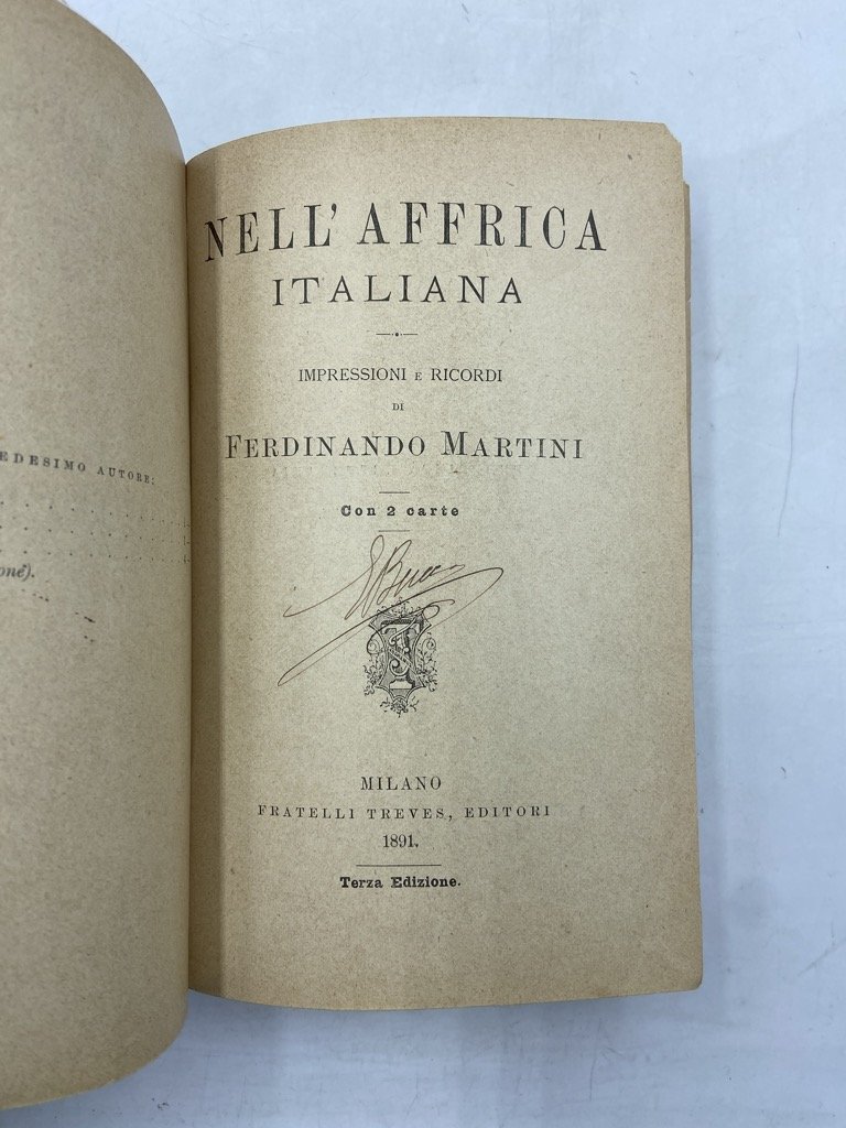 Legatura coeva in mezza pelle con titoli dorati sul dorso, in ottavo cm 19x13, pp (8) 289 (1), due carte geografiche ripiegate. Discreto esemplare, tracce d'uso. Viaggio in Eritrea effettuato nel 1891 dalla Commissione d’Inchiesta sulla Colonia Eritrea, cui Martini prese parte come Vicepresidente prima di essere nominato Governatore del territorio dal 1897 al 1905. Il volume è corredato di una Carta della Colonia Eritrea (1:400000) e di una con l’itinerario del viaggio.