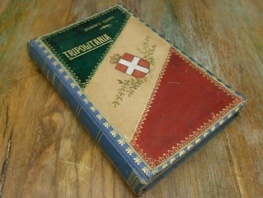 (Viaggi - Nordafrica - Libia - Colonialismo) In 8°, legatura coeva in piena tela color blu "carta da zucchero" con titoli ed impressioni in oro, il piatto anteriore è interamente occupato da una placca composta tre diversi tipi di pelle inseriti a mosaico che formano la bandiera tricolore italiana, al centro della fascia bianca lo stemma sabaudo e rami d'alloro dipinti a mano, titoli e filetti ornati in oro, guardie in carta decorata a motivo floreale, pp. XIX,(1),291,(5), con 39 tavole su carta patinata fuori testo con decine di illustrazioni fotografiche in bianco e nero. Diario del viaggio in Libia compiuto fra il 1904 e il 1905 dallo scrittore e drammaturgo Domenico Tumiati. Alcune tracce di ossidazione ad alcune pagine, esemplare solido e ben conservato in piacevole legatura.