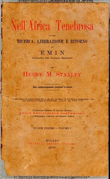NELL'AFRICA TENEBROSA ovvero ricerca, liberazione e ritorno di Emin Governatore della Provincia Equatoriale. Con centocinquanta incisioni e carte. Traduzione italiana di Adolfo Massoni unica autorizzata dall'autore e perfettamente conforme all'originale inglese.