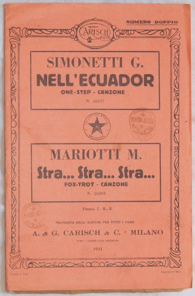 Bello spartito, partitura completa per orchestra del 1931 di due canzoni. Caratteristica copertina illustrata. GENERE: One step, fox trot STRUMENTI: violino; violoncello; trombone; clarinetto; sassofono; flauto; batteria ANNO: 1931 DIMENSIONI: In 8. cm 27,5x18 PAGINE: pp. 22 CONDIZIONI: Ottime condizioni NOTE: Ex libris sulla copertina ed in qualche pagina. Beautiful score of one song, a complete score for orchestra of 1931. Carachteristic decorated cover of that period. MUSIC: One step, fox trot STRUMENTI: violin; violoncello; trombone; clarinet; saxophone; flute; drums YEAR: 1931 SIZE: In 8. cm 27,5x18 PAGES: pp. 22 CONDITIONS: Very good conditions NOTES: Ex libris in the cover and in some pages.