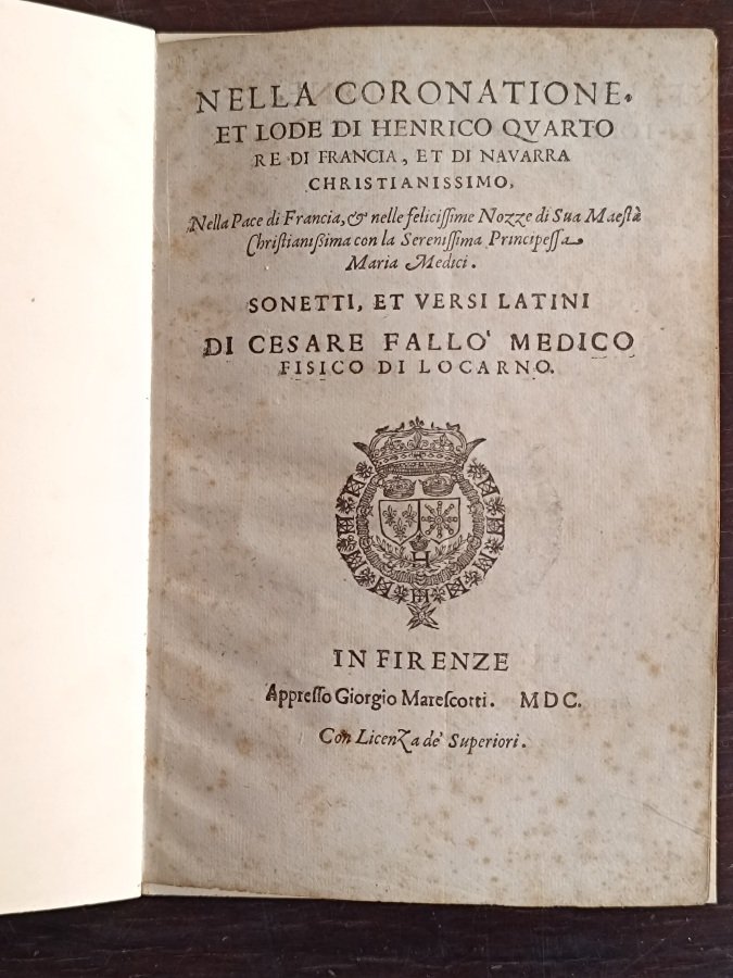 <span style="font-style: normal;">In-4° (cm. 22), legatura successiva in cartoncino muto; pp. [4] non numerate, in stato molto buono (lievi fioriture); stemma reale di Enrico IV al frontespizio, capolettera, finalino e bel </span><i>colophon</i> xilografici. Prima e rara edizione di questa raccolta di componimenti in versi italiani e latini pubblicati a cura di Cesare Fallò, nella triplice occasione dell'incoronazione di Enrico IV a re di Francia, della promulgazione dell'Editto di Nantes e delle nozze di quest'ultimo con Maria de' Medici. Esemplare molto buono. (NO8)