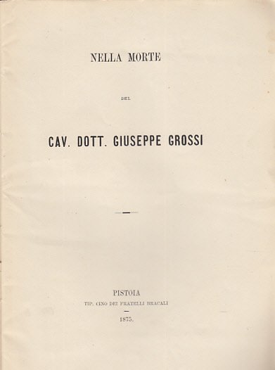 In-8 (Cm 22,5 x 15,5), pp. 22, brossura muta. Ex libris Pieri Gerini. MOLTO BUONO - Giuseppe Grossi nacque a Pistoia, fu conservatore presidente dell'accademia di Scienze Lettere ed Arti, segretario della festa delle Spighe a cui dette col presidente ed amico Puccini vita ed impulso, Capitano di Guardia Civica, Deputato per Porta al Borgo all'Assemblea Toscana che portò alla decadenza dei Lorena, consigliere comunale e provinciale .