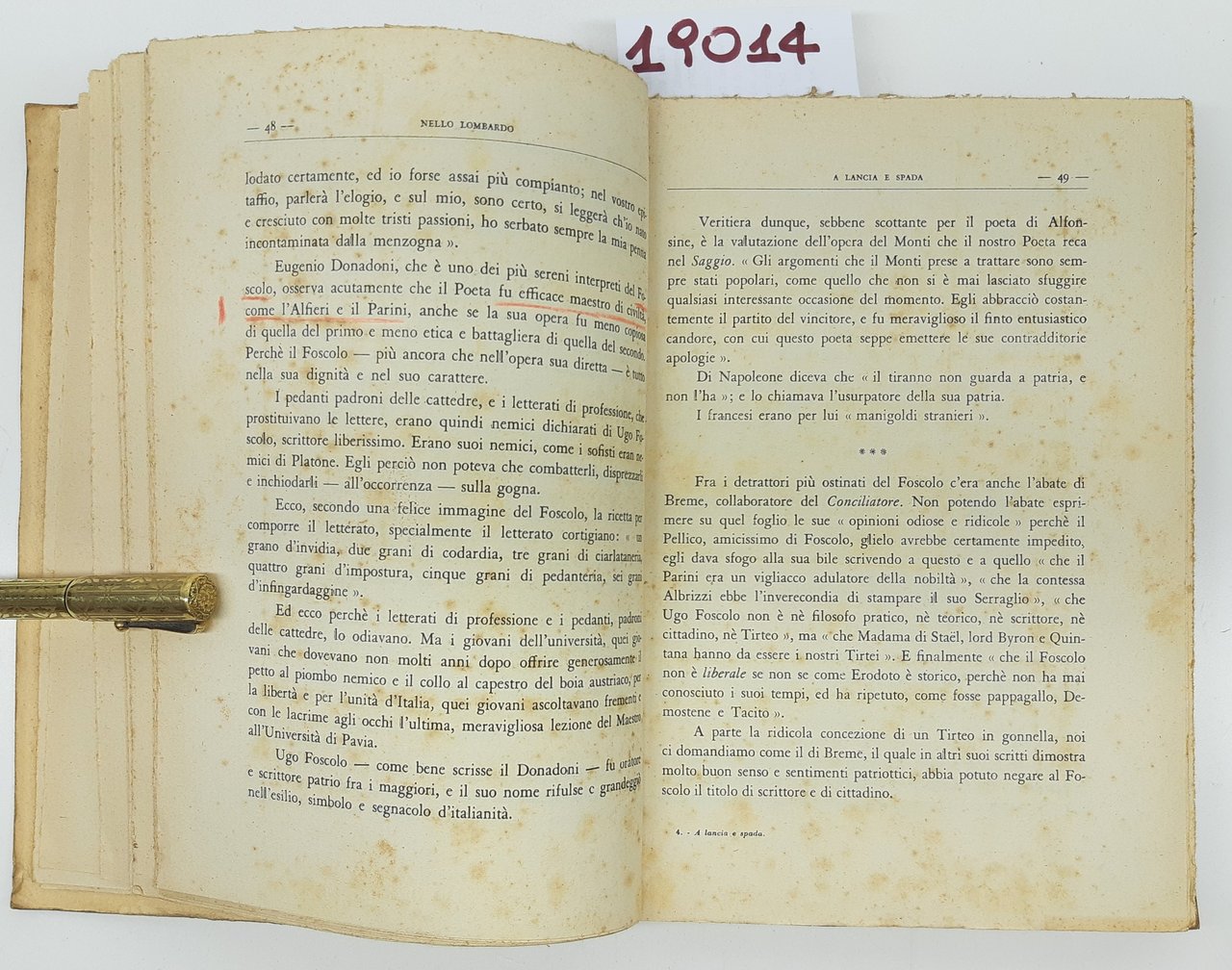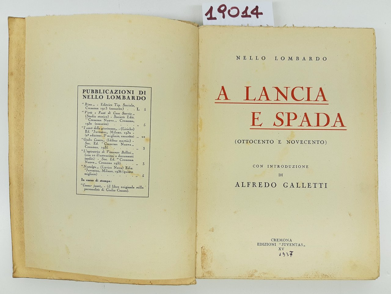 Nello Lombardo A Lancia e spada Ottocento e Novecento Juventas 1937