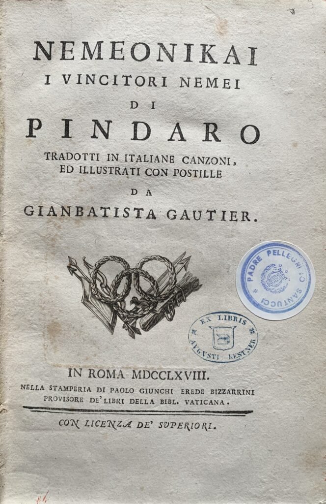 Nemeonikai (I vincitori Nemei). Tradotti in italiane canzoni ed illustrati con postille da Gianbattista Gautier.