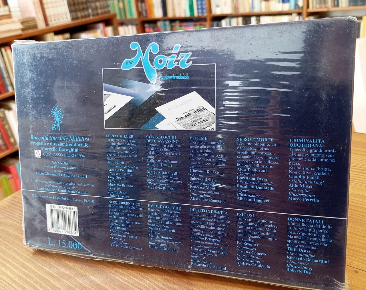Raccolta Speciale Millelire; inediti di autori italiani - Custodia editoriale contenente 10 libricini della collana "Millelire". La confezione imita lo storico packaging dei Baci Perugina disegnato da Federico Seneca. Copia in stato di nuovo, ancora nel suo cellophane editoriale; non comune -- Dettaglio dei contenuti. SERIAL KILLER : la figura centrale dell'immaginario di fine millennio, colui che uccide senza motivo e che ha la nostra stessa faccia. Testi di: John Haigh, Antonio Pedicini, Luigi Seviroli, Massimo Brando. Illustrazione di Guido Crepax -- CON GLI OCCHI DELL'ASSASSINO : il punto di vista del male, di chi pratica l'arte del delitto o dell'assassinio. Testi di: Antonio Tentori, Marco Minicangeli. Illustrazione di Maurizio Ribichini -- VITTIME : l'esatto contrario rispetto alla centralità dell'assassino. Vittime-vittime o vittime che si possono tramutare a loro volta in carnefici. Testi di : Giovanni De Feo, Sabrina Deligia, Federico Monti. Illustrazione di Alessandro Romagnoli -- SESSO E MORTE : l'eterno binomio: eros e Thanatos, nel suo aspetto più corposo e sessuale. Dove la morte si sposa con la bellezza, in nome dell'orrore. Testi di : Alda Teodorani, Loredana Fayer, Elisabeth Donatello. Illustrazione di Alberto Ruggieri -- CRIMINALITA' QUOTIDIANA : I piccoli e grandi crimini che avvengono sempre, nelle città come nei paesi. Realtà sporca, brutta. Non cattiva, crudele. Testi di : Claudio Fausti, Aldo Musci. Illustrazione di Marco Petrella -- NERO CIBERNETICO : il neo-noir e il cyber, una possibile fusione. I delitti nei meandri della realtà virtuale. Il computer come strumento di morte. Testi di : Pino Blasone, Alessandra Santini. Illustrazione di Vla (Claudio Romussi) -- FAVOLE GOTICHE : il racconto del terrore classico, i temi della fiaba macabra, modernizzati e calati nel contesto neo-noir. Testi di: Nicola Lombardi, Marzia Bonato. Illustrazione di Giuseppe Manunta -- DELITTI IN DIRETTA : la fiction che si ispira a fatti di sangue realmente accaduti. Il fascino orribile della realtà, dove l'immaginario si alimenta nella cronaca nera. Testi di : Claudio Pellegrini, Giuseppe Magnarapa. Illustrazione di Riccardo Bernardini -- PSICOSI : tutto ciò che può improvvisamente invadere l'animo umano. Menti incrinate, raptus devastanti. Quando la ragione vacilla. Testi di : Ivo Scanner, Tiziana Colusso. Illustrazione di Andrea Camiciola -- DONNE FATALI : l'altra faccia del delitto, forse la più pericolosa. Argento insegna. Ma anche la vamp, fatale eppure non necessariamente assassina. Testi di : Tinto Brass, Riccardo Bernardini. Illustrazione di Roberto Diso.