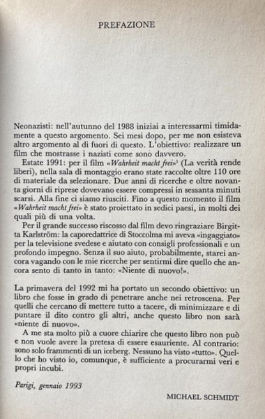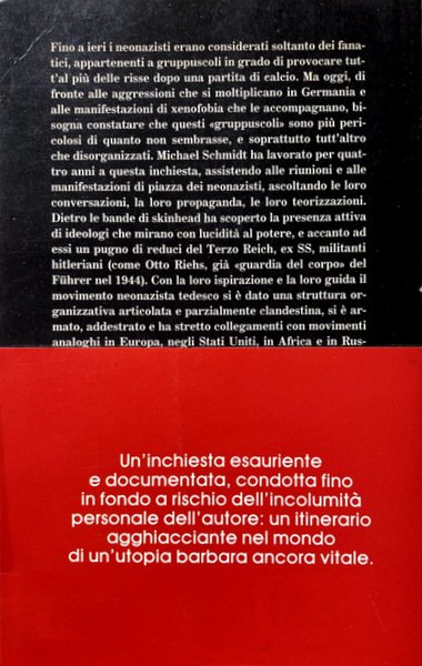 Michael Schmidt ha scoperto, dietro le bande di skinhead, la presenza attiva di ideologi che mirano al potere e accanto ad essi, un pugno di reduci del Terzo Reich, ex SS, militanti hitleriani. Con la loro ispirazione e la loro guida il movimento neonazista tedesco si è dato una struttura organizzativa articolata e parzialmente clandestina e ha stretto collegamenti con movimenti analoghi in Europa, negli Stati Uniti, in Africa e in Russia. ci conduce nelle pieghe più nascoste del nuovo capitalismo sovietico.