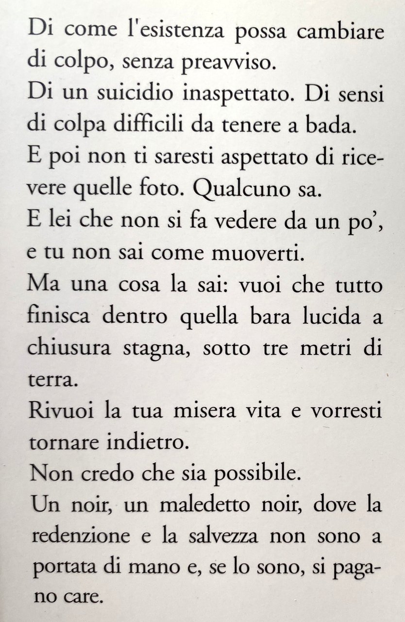 Nero in dissolvenza è un noir maledetto, scandito con ritmo e tono asciutto che cattura fin dalle prime pagine. Una storia durissima, dove gli spiragli di salvezza sfuggono in ogni momento, con un capovolgimento continuo di ruoli e certezze. Un suicidio. Un ricatto. Vorresti che tutto finisca dentro quella bara lucida, sotto tre metri di terra. Vorresti indietro la tua misera vita ma sai che sarà difficile. Tutto sta precipitando dentro una storia nera dove la redenzione e la salvezza, se esistono, si pagano care.