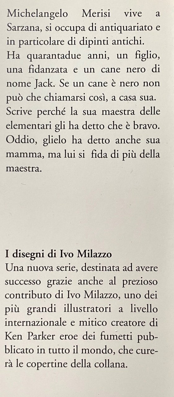 Michelangelo Merisi vive a Sarzana, si occupa di antiquariato e in particolare di dipinti antichi. Ha quarantadue anni, un figlio, una fidanzata e un cane nero di nome Jack. Se un cane è nero non può che chiamarsi così, a casa sua. Scrive perché la sua maestra delle elementari gli ha detto che è bravo. Oddio, glielo ha detto anche sua mamma, ma lui si fida di più della maestra. I disegni di Ivo Milazzo. Una nuova serie, destinata ad avere successo grazie anche al prezioso contributo di Ivo Milazzo, uno dei più grandi illustratori a livello internazionale e mitico creatore di Ken Parker eroe dei fumetti pubblicato in tutto il mondo, che curerà le copertine della collana.