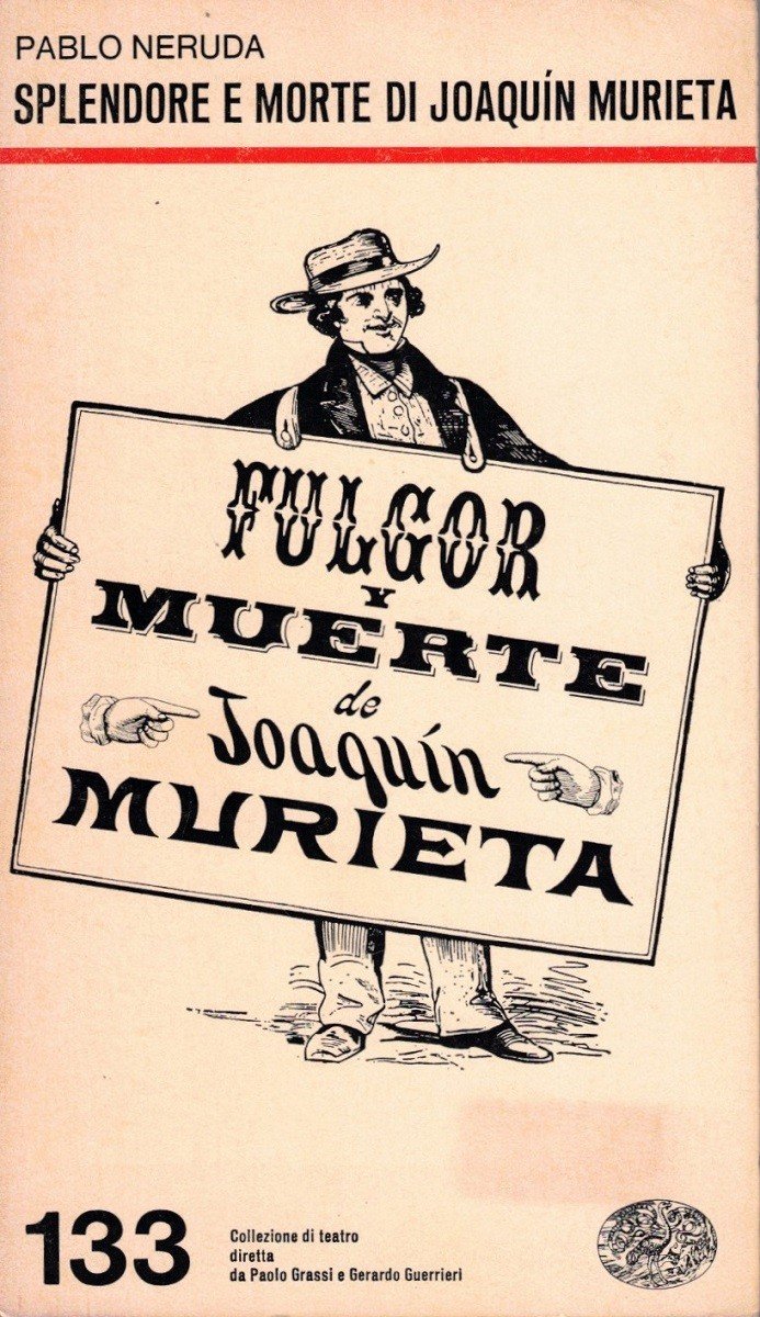 Pablo Neruda, Splendore e morte di Joaquín Murieta bandito cileno giustiziato in California il 23 luglio 1853, Giulio Einaudi editore, Torino 1980, quinta ed., pp. 105, ill. b.n., cm 18, br. ed. Collana Collezione di teatro, vol. 133. Titolo originale dell’opera: Fulgor y muerte de Joaquín Murieta. Traduzione di Vittorio Bodini. Minima brunitura della carta, per il resto ottimo.