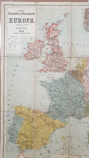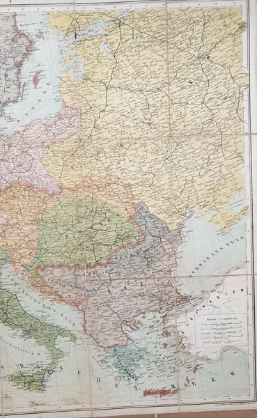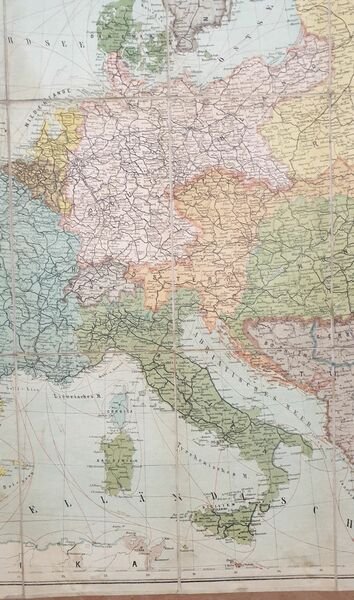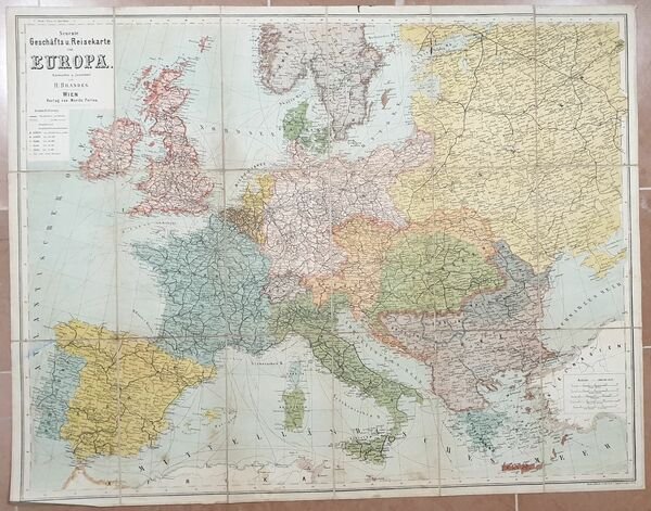 Bella mappa telata di inizio novecento dell'Europa pubblicata da H. Brandes. Di grandi dimensioni. AUTORE: H. Brandes DIMENSIONI FOGLIO: 790x620 mm DIMENSIONI INCISIONE: 785x610 mm EPOCA: inizio novecento CONDIZIONI: buone condizioni. Beautiful cloth map of early 20th century of Europe published by H. Brandes. Of big size AUTHOR: H. Brandes LEAF DIMENSION: 790x620 mm ENGRAVING DIMENSION: 785x610 mm DATE: early 20th century CONDITIONS: Very good conditions.