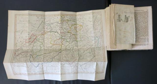 Praga, 1820. Tomo V. In 8vo, front. con vignetta incisa, pp. 578. A inizio volume una carta della Svizzera f. t. più volte rip. e con confini in colore d’epoca, sono presenti alcune tavole in b/n (costumi, una pianta e alcuni scorci della Svizzera, tra cui la montagna del grande Bernhard; per l'Italia è presente la veduta di Piazza San Pietro a Roma e le grotte di Posillipo presso Napoli). Leg. in mz. pelle con titoli e fregetti oro su tasselli in arancione e verde, piatti in cartonato marmorizzato. Esemplare scompleto delle tavole relative all’Italia (mancano la carta dell’Italia e della Sicilia con Malta, molte delle vedutine di città, le piante di Napoli e Venezia), completa la parte relativa alla Svizzera. Un usuale ingiallimento ma buono, bella e ben colorata la carta a inizio volume.