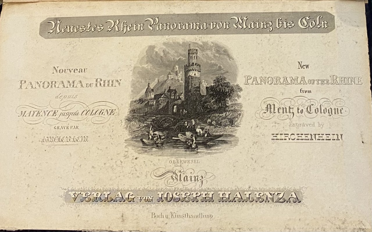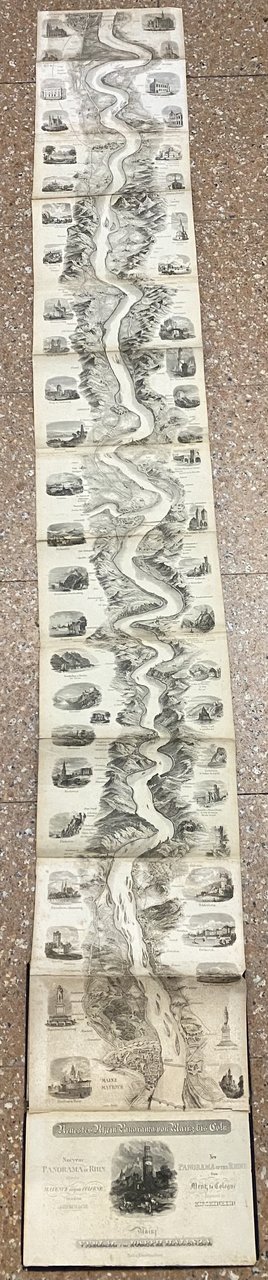Neuestes Rhein Panorama, von Mainz bis Cöln, Mainz, Jos Halenza, 1880. Cm 25,7 x 15,6. . Cartonato editoriale, con titoli in oro ai piatti di colore nero. Parziale minima brunitura ai fogli, uno strappo e tracce di usura alla legatura. Veduta pieghevole in 12 parti. Da Colonia a Mainz. Il paesaggio si snoda lungo il fiume Reno mediante una vista a volo d'uccello. A destra e a sinistra del fiume sono illustrati numerosi monumenti, statue, castelli, chiese e ponti. All'interno del piatto inciso il titolo in francese, tedesco e inglese intorno a una piccola veduta intitolata Oberwesel, indicazione dell'editore e dell'incisore: Hirchenhein.