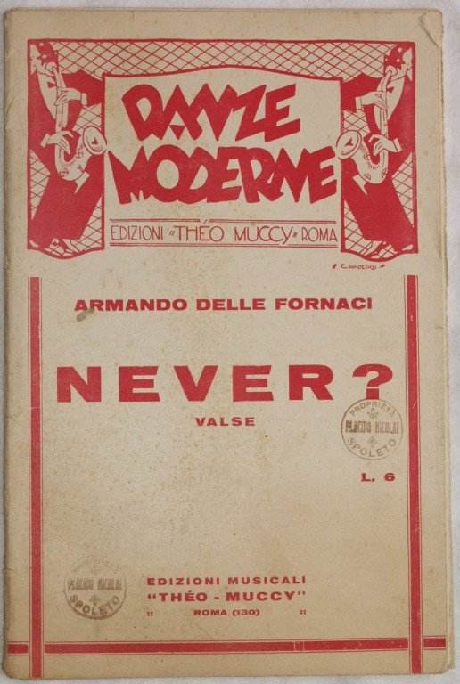 In 8. cm 27x18. pP. 19. partitura completa per orchestra del 1930 circa di una canzone. Caratteristica copertina illustrata d'epoca. In buone condizioni; usure al dorso Ex libris sulla copertina. a complete score for orchestra of 1930. Carachteristic decorated cover of that period. In good conditions; worn spine. Ex libris in the cover.