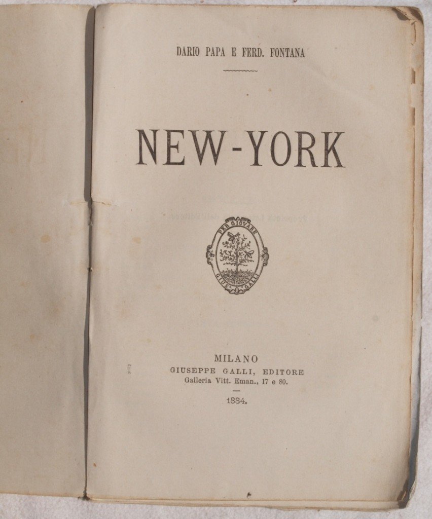 In 8. Dim. 19,5x13 cm. Pp. VI+502. Rara prima edizione del 1884 di questa nota guida di New York di Dario Papa e Ferdinando Fontana. L'opera è in un volume ed è completa. Nella prima parte gli autori descrivono New York come si presentava al tempo (Broadway, Dow-Town, i veicoli di New York, il Castle Garden, Brooklyn, Boarding-house, connazionali ecc.). Nella seconda descrivono la società newyorkese e le persone (razze, bambini, studenti, uomini, donne, società, comfort). Interessante spaccato di vita ottocentesca della grande mela. Brossura editoriale. Alto valore. Brossura editoriale in mediocri condizioni generali con lievi usure e parti mancanti ai margini e dorso; piatto anteriore mancante. Legatura in discrete condizioni con rotture. All'interno le pagine si presentano in buone condizioni con rare fioriture. Segni di sporco. Scarce first edition of 1884 of this famous guide of New York by Dario Papa and Ferdinando Fontana. The work is in one volume and it is complete. In the first part the authors describe New York as it was in that time (Broadway, Dow-Town, the vehicles of New York, the Castle Garden, Brooklyn, Boarding-house, italian people etc.). In the second part they describe New York society and people (races, children, students, men, women, society, comforts). Interesting description of life in the XIX century inthe Big Apple. Editorial cover.vHigh value.vEditorial cover in poor general conditions slightly worn with missing parts in the edges and spine; front plate is missing. Binding in fair conditions with cracks. Inside pages are in good conditions with occasional foxings. Dirt's signs.v